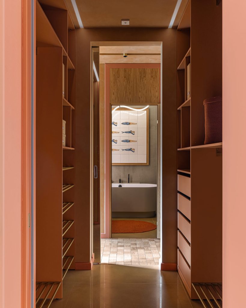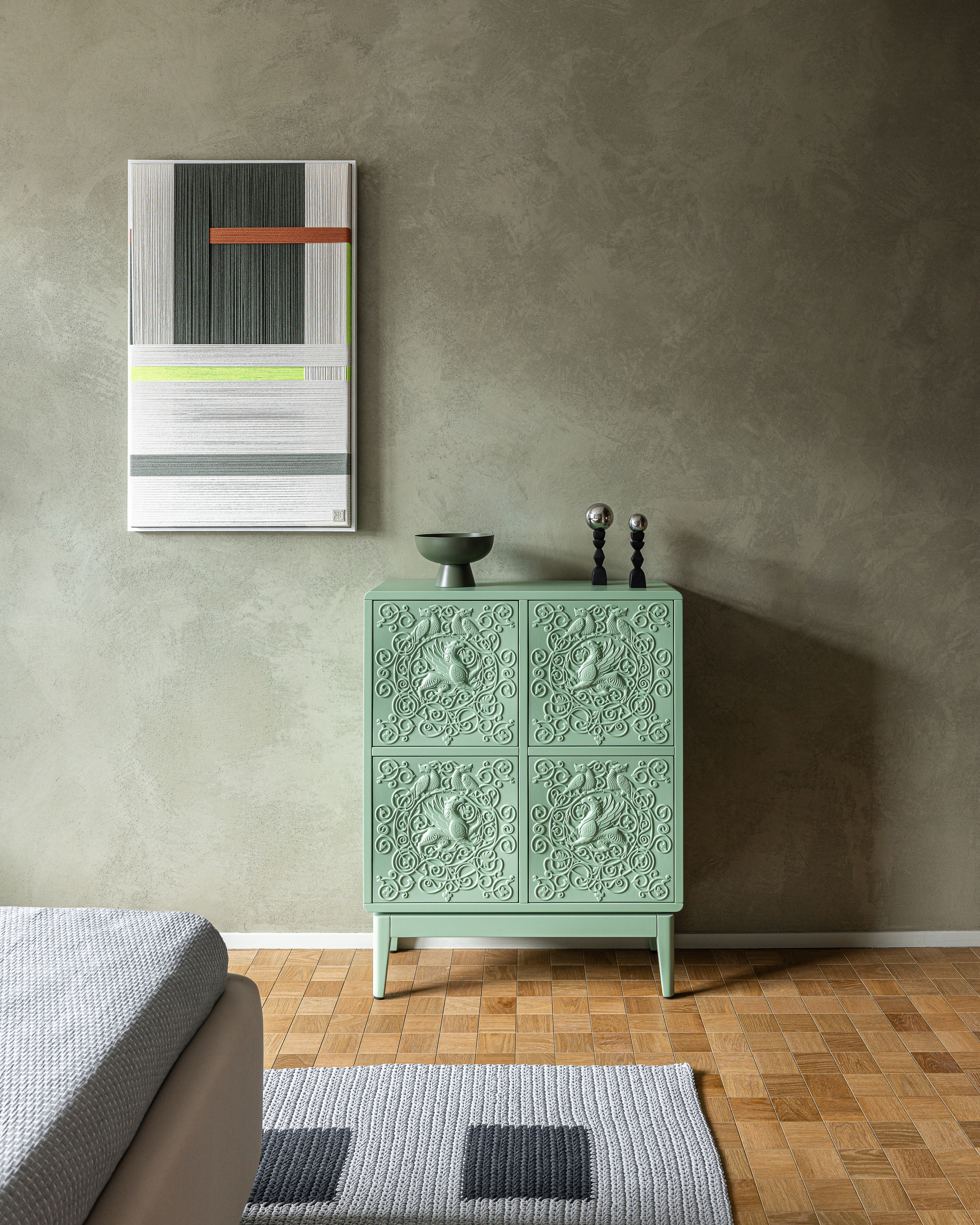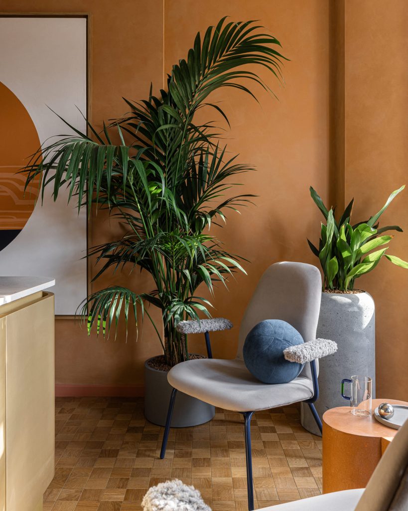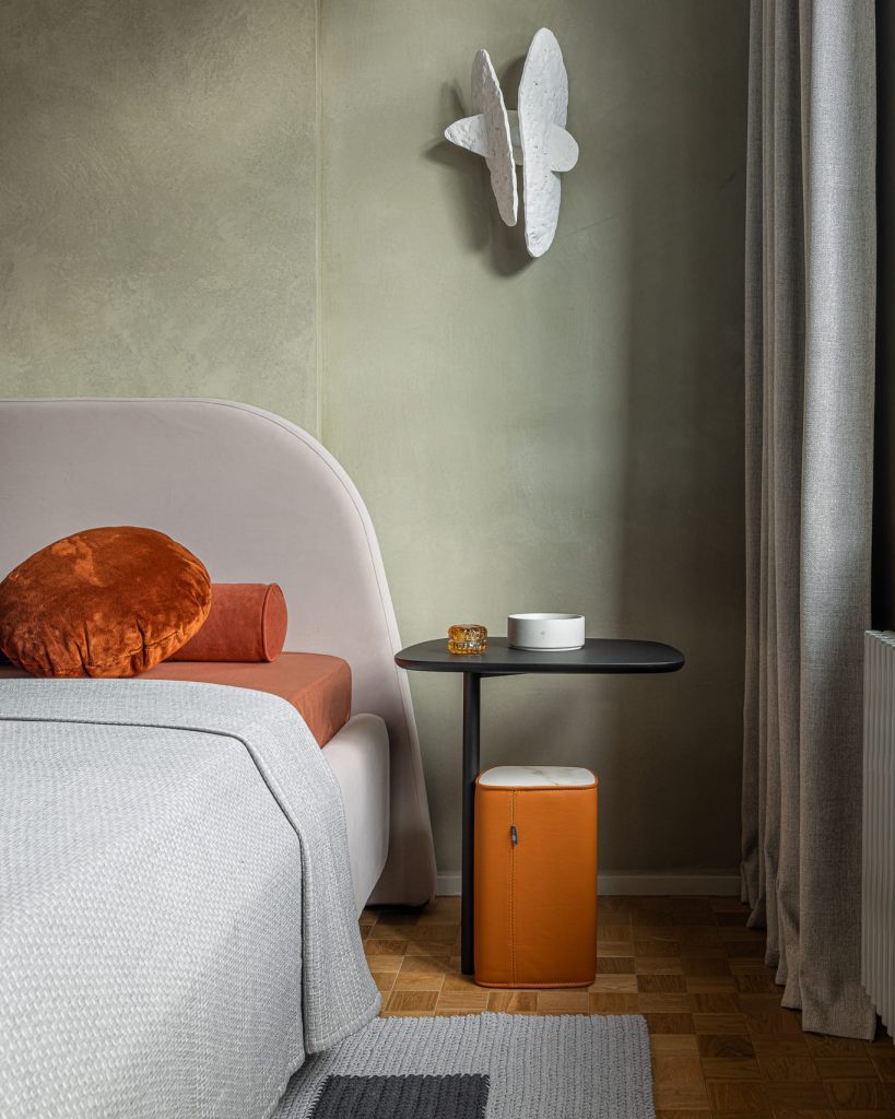 Если общественная зона насыщена солнцем, то приватная часть словно уходит в тень. Для стен дизайнер выбрала серый микроцемент, который неожиданно ушёл в тёплый хаки и создал идеально спокойную, камерную атмосферу. Вся обстановка написана крупными мазками: лаконичная мебель, геометричные формы, портьеры с фактурой рогожки… Особую роль отвели комоду с грифонами: застройщика вдохновил особняк Тихона Булычёва авторства архитектора Чарушина, и Анна Исупова отдала дань уважения знаковой детали неоготического здания.