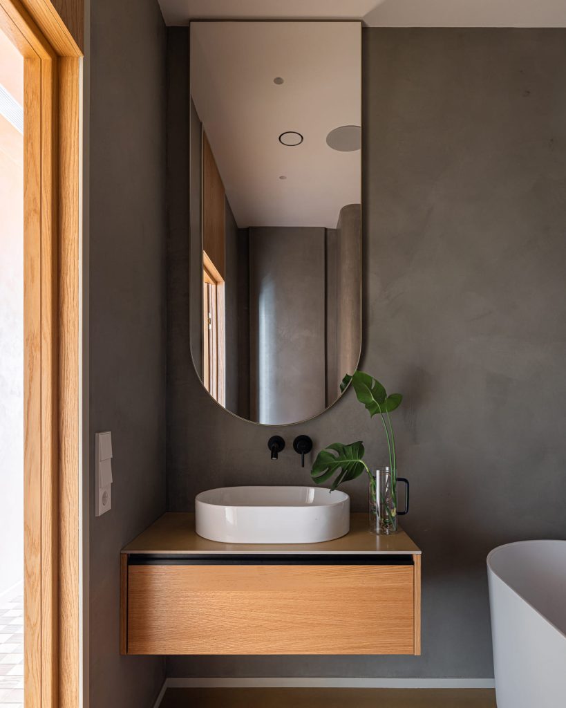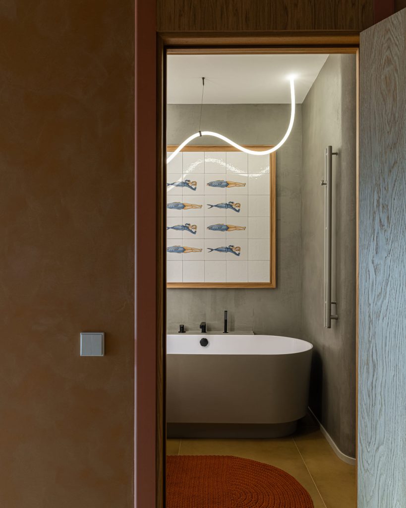 Демонстрационный объект допускает самые смелые и креативные решения: так, Анна Исупова выбрала белоснежную ванну из литого мрамора с серым торцом — эта деталь звучит в унисон цвету стен, покрытых микроцементом. При этом от традиционной плитки на стенах автор проекта отказалась. Плитка в интерьере появилась, но в качестве арта: принты на керамике из коллекции REDA Дарьи Васильковой превратились в стильное панно в дубовом кэнвасе. Этот ироничный акцент отлично дополнил незаурядное, харизматичное и позитивное пространство, созданное дизайнером.