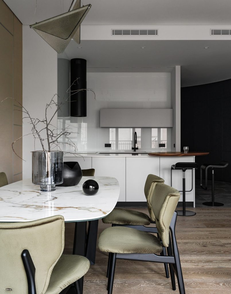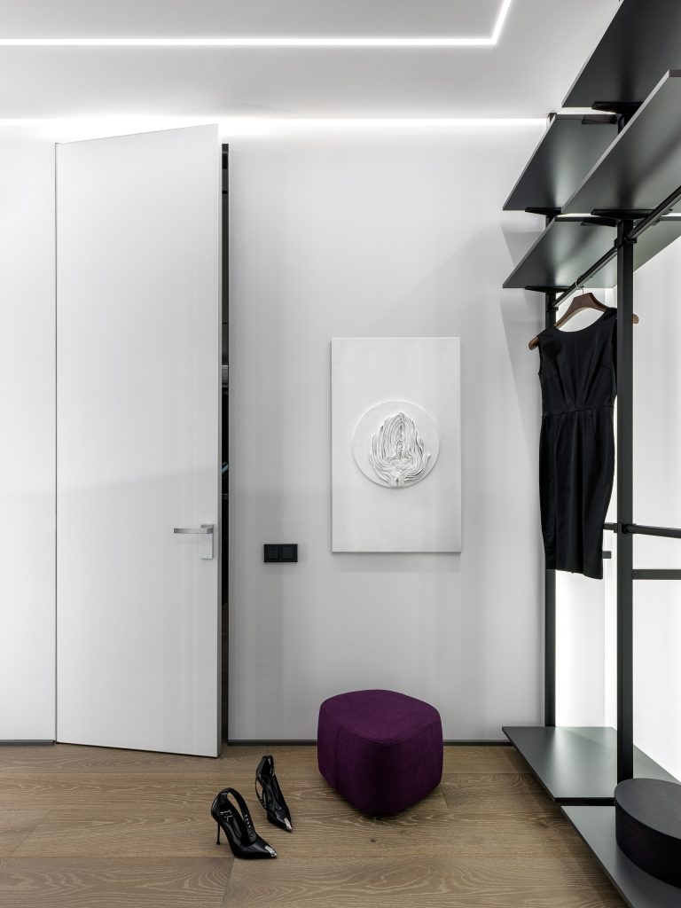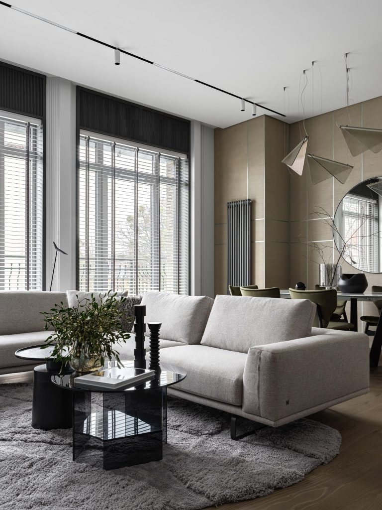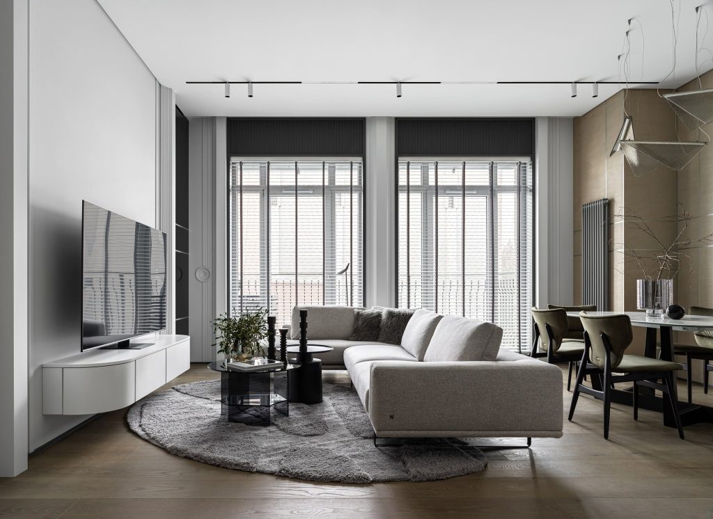 Достоинством квартиры является то, что вводы коммуникаций сделаны по обе стороны от входа в квартиру. Это дало нам возможность для перепланировки и работы с пространством. Все окна в квартире — панорамные, а высота потолков составляет 3 280 мм.