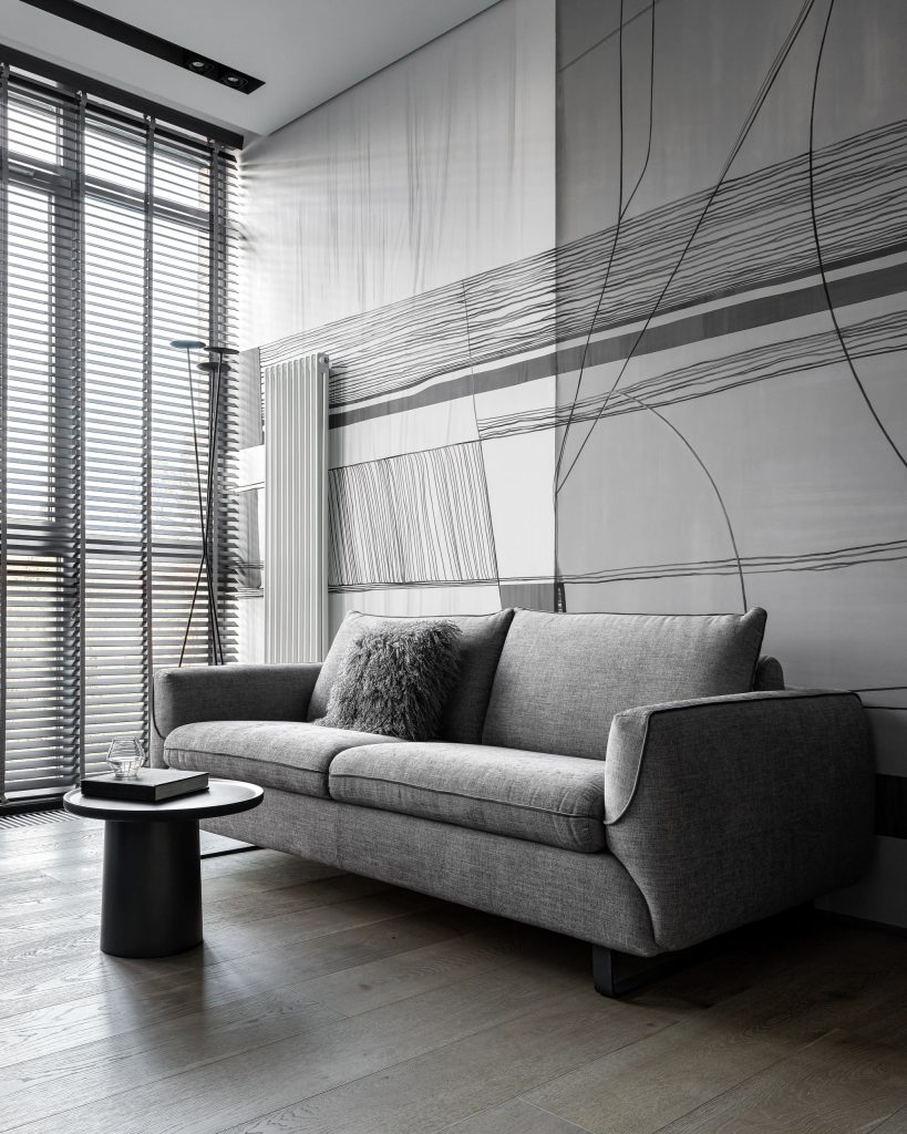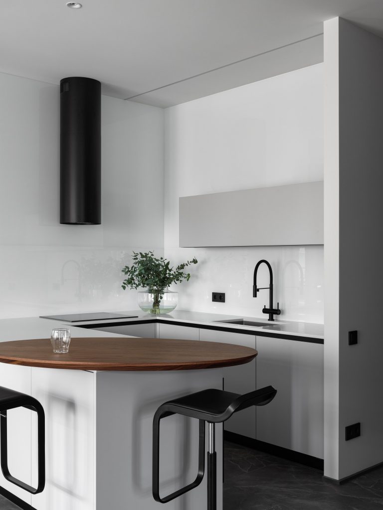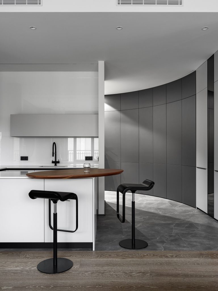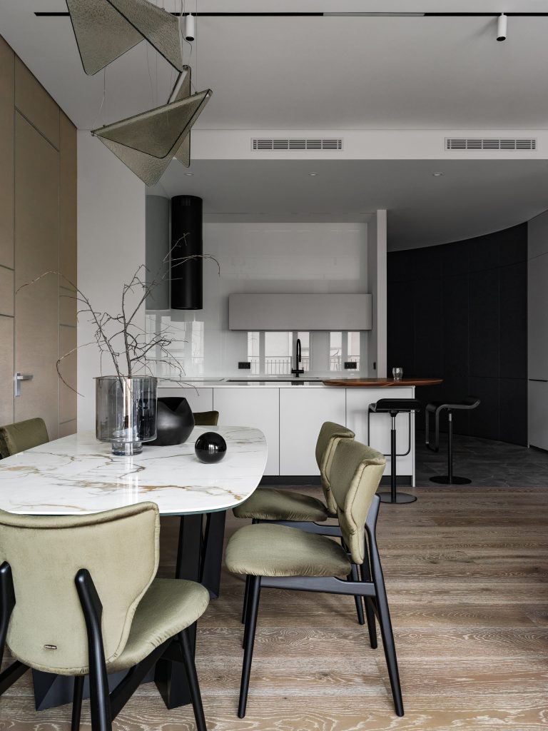 Достоинством квартиры является то, что вводы коммуникаций сделаны по обе стороны от входа в квартиру. Это дало нам возможность для перепланировки и работы с пространством. Все окна в квартире — панорамные, а высота потолков составляет 3 280 мм.