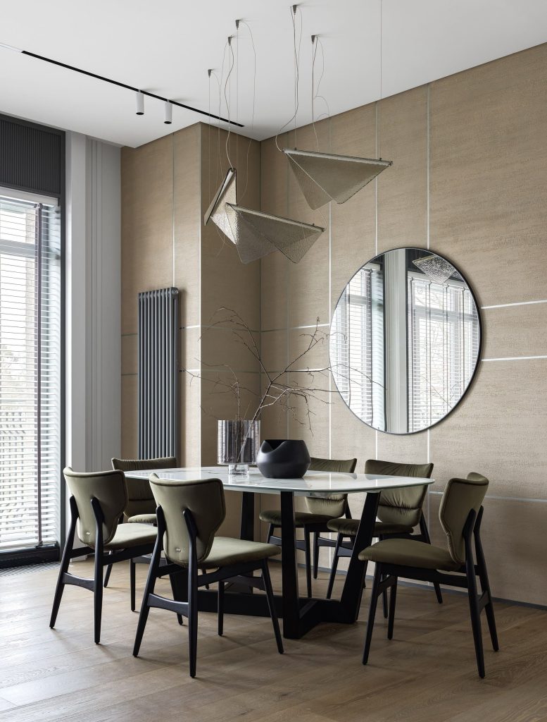Для реализации проекта мы использовали высококачественные отделочные материалы: на пол положили инженерную доску под маслом бренда RUDDA, стены оформили декоративной штукатуркой OIKOS Травертино Романо и Креос и краской RALSTON. Керамогранит выбрали от IRIS FMG. Декоративные элементы ORAC Decor добавили особую тонкость. Очень правильным решением было сделать роспись в кабинете: работа художника Натальи Фоминовой смотрится стильно и динамично.
