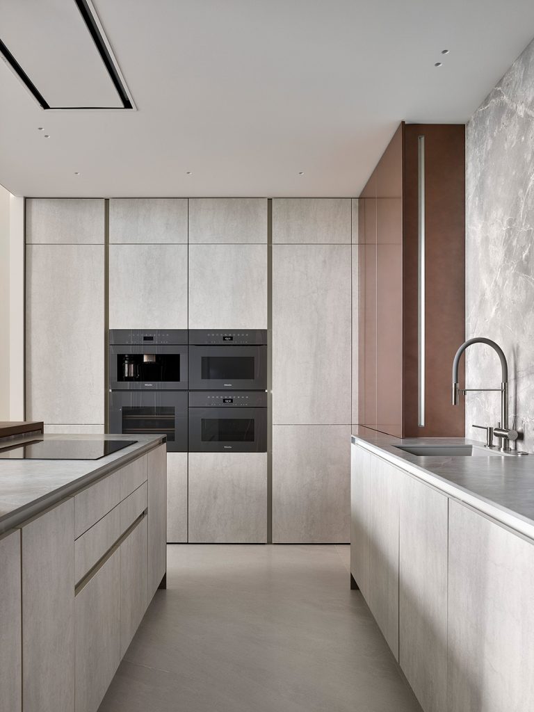 Здесь нет привычных навесных шкафов — их функцию выполняет масштабный стеллаж, занимающий всю стену и органично вписанный в общую концепцию. В отделке преобладают спокойные, натуральные оттенки, а скрытые системы хранения устраняют визуальный шум, создавая ощущение лёгкости и порядка.