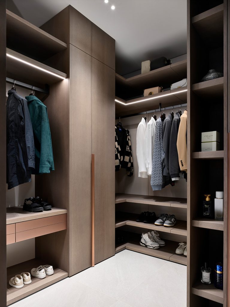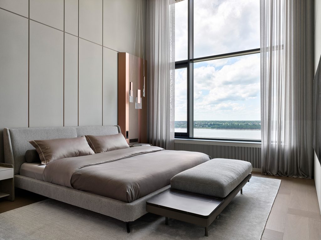 Мастер-блок полностью изолирован от остального пространства и включает спальню, гардеробную и душевую.