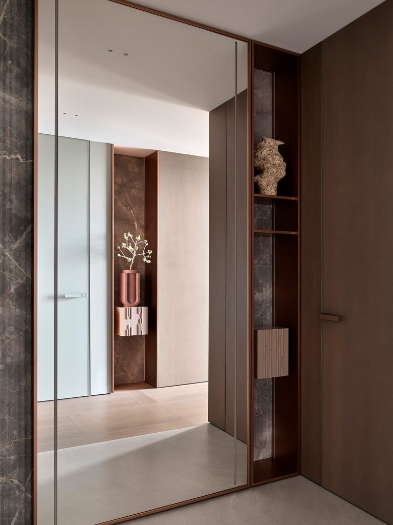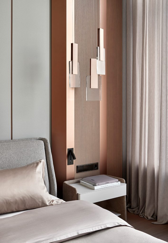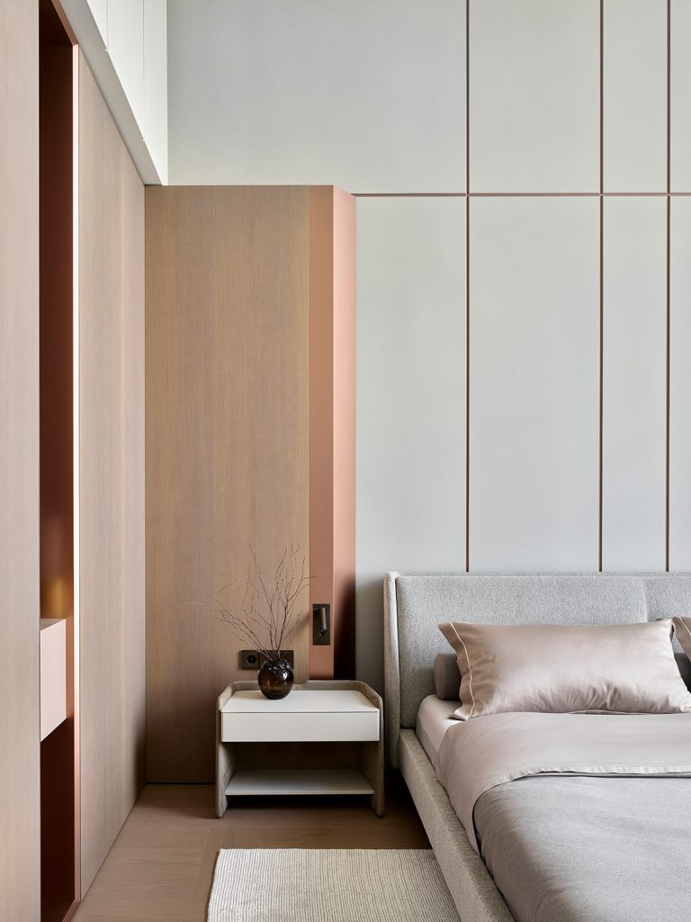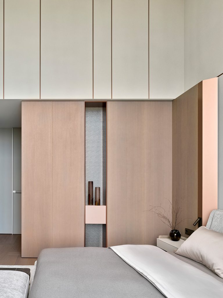 В спальне акцент сделан на инкрустацию треугольного профиля в стены — изящная деталь, перекликающаяся с плиссировкой мрамора в гостиной и создающая единый художественный мотив.