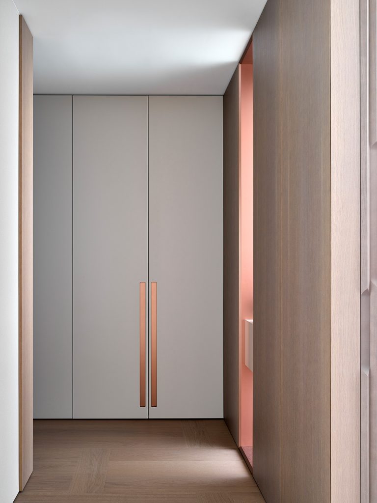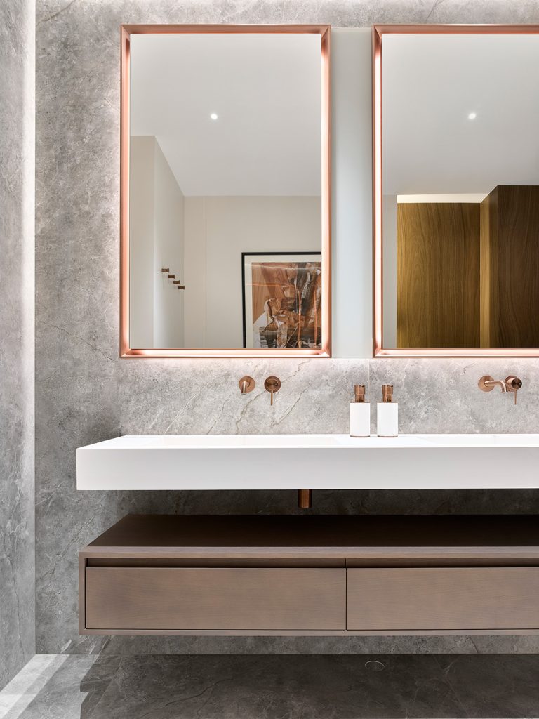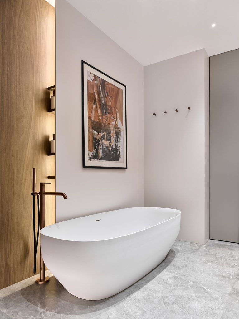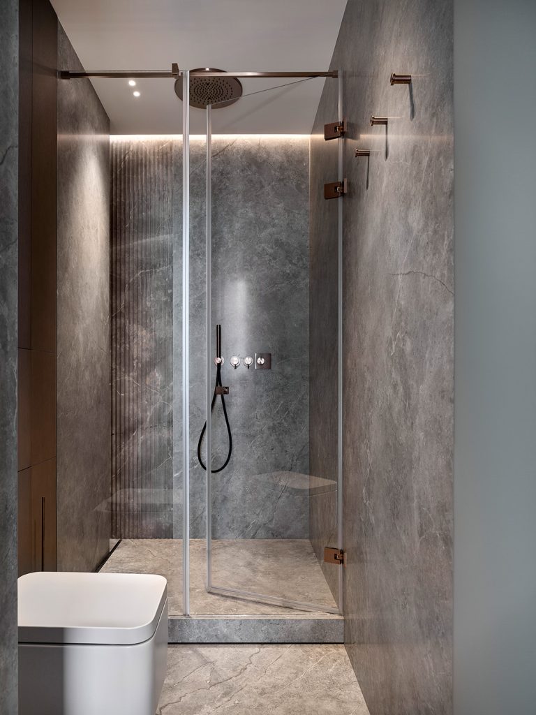 В гардеробной и ванной потолки намеренно занижены: здесь сосредоточены инженерные системы, что позволило сохранить чистоту линий в основных помещениях.