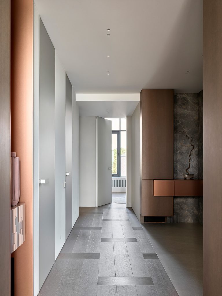 Прихожая выступает своеобразной увертюрой к проекту: именно здесь раскрываются основные материалы и отделочные приёмы, которые находят своё продолжение во всех остальных комнатах.