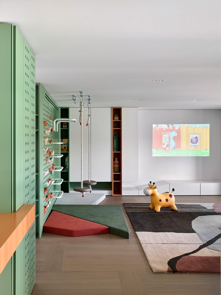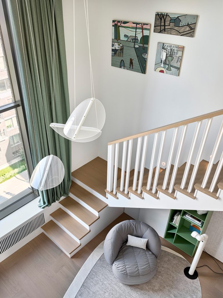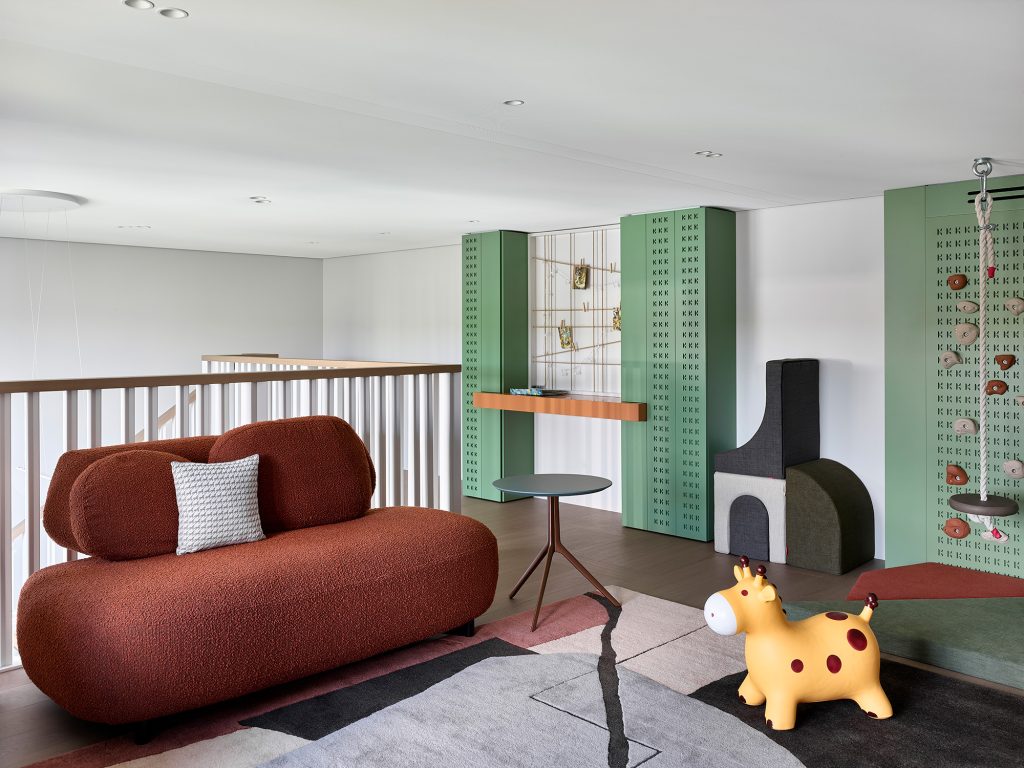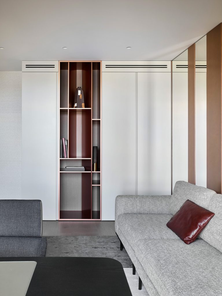 Индивидуально спроектированный стеллаж, предназначенный для будущей коллекции хозяев, подчёркивает уникальность пространства и его персонализированный характер. Ключевая архитектурная особенность — потолки высотой 5,5 метров — задаёт масштаб и требует особого внимания к вертикали, что реализовано с безупречным вкусом.