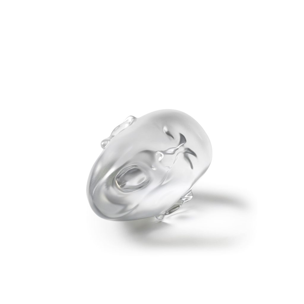В сотрудничестве с Lalique этот образ был переведён в кристалл — материал, который придаёт фигуре новое звучание. Прозрачность и плотность кристалла усиливают ощущение уязвимости и одновременно подчёркивают физическое присутствие объекта. Скульптура выглядит хрупкой и монументальной одновременно, меняясь в зависимости от освещения и точки зрения.