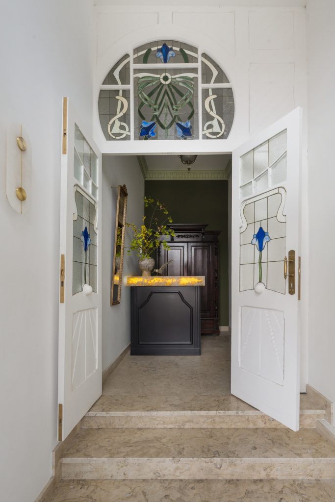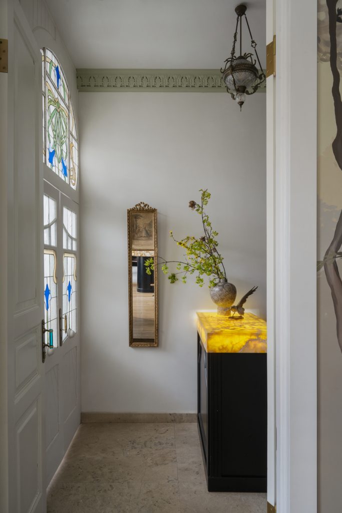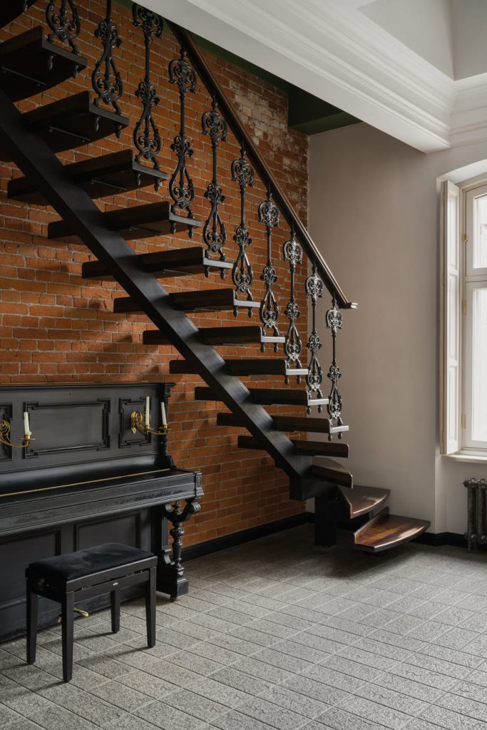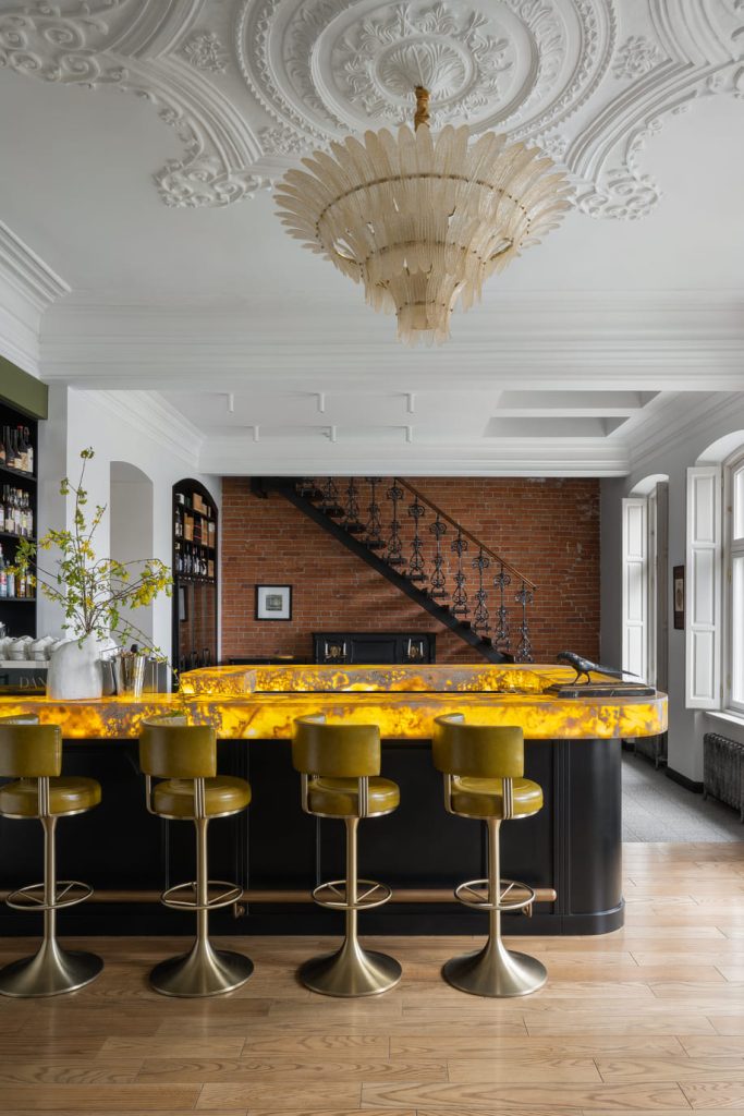 Отчасти такой эффект обусловило само здание и его вековая история. Несмотря на то, что перепланировка была кардинальной и на месте остались лишь мокрые зоны, команда бюро «КРУГ» проявила особый такт по отношению к локации — например, лепные элементы были бережно отреставрированы, как и витражи при входе.