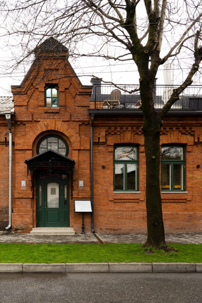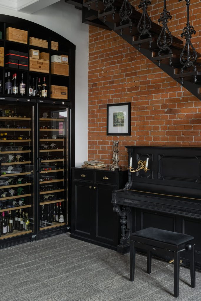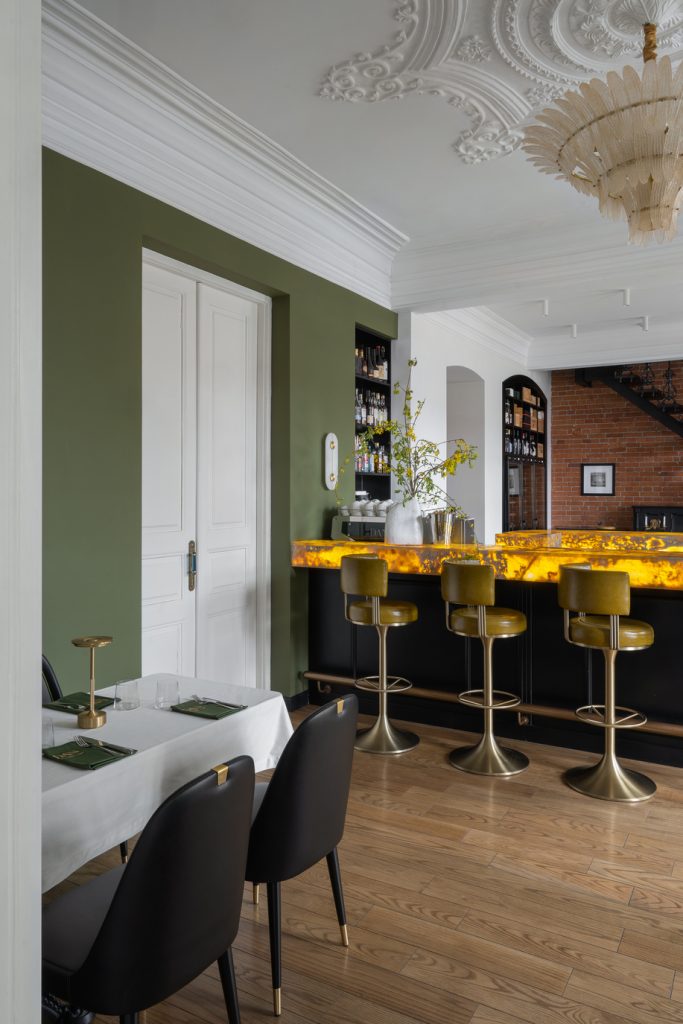Вневременные ноты принесли в пространство натуральные материалы: они всегда смотрятся дорого, красиво стареют, в любых сочетаниях выстраивают гармоничный и эстетичный ансамбль. Вот и в интерьере ресторана в прекрасную мелодию переплелись басовые ноты солидного мрамора, душевное звучание тёплого дерева, глухие тона старого кирпича, звонкая латунь… И эта музыка способна звучать каждый раз по-новому — благодаря тому, что Анна Гудиева и Александр Габуев ввели в интерьер множество источников освещения. Центральная люстра задаёт торжественный и парадный тон, бра с матовыми плафонами создают уютную обстановку, подсвечники и настольные светильники делают вечер романтичным и камерным — и тогда кажется, что рамки времени раздвигаются, история становится ближе, эмоции ярче, а жизнь ещё прекраснее…