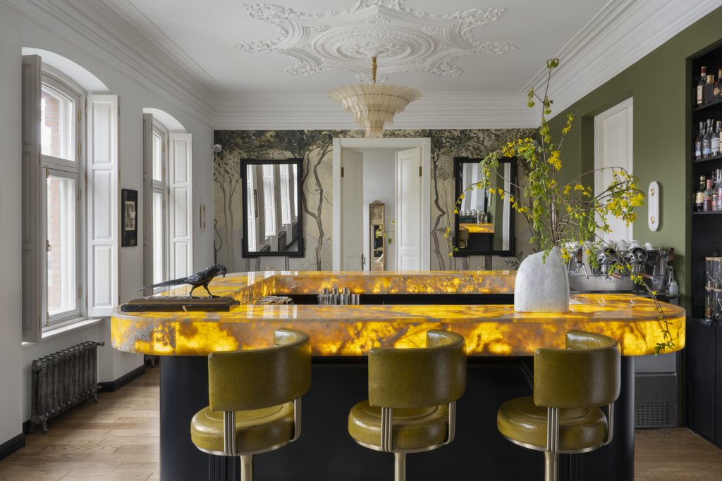 Главный магнит в пространстве первого этажа — это, конечно, барная стойка, выполненная из роскошного оникса. Завораживающая фактура, медовые оттенки, лучистое тёплое свечение никого не оставляют равнодушным. Конечно, во Владикавказе нет недостатка в солнечном свете, но вечерами или в холодный сезон, заметив через большие окна ресторана такую эффектную деталь, трудно отказать себе в удовольствии заглянуть в бар «Дан». Тем более что и барные стулья оттенком обивки напоминают об оливках — и вкусных коктейлях…