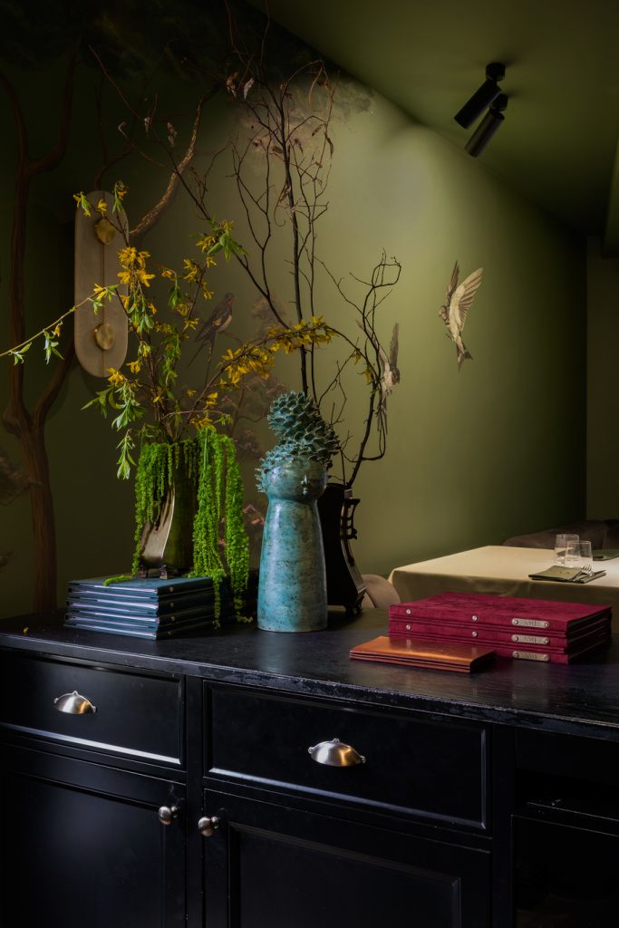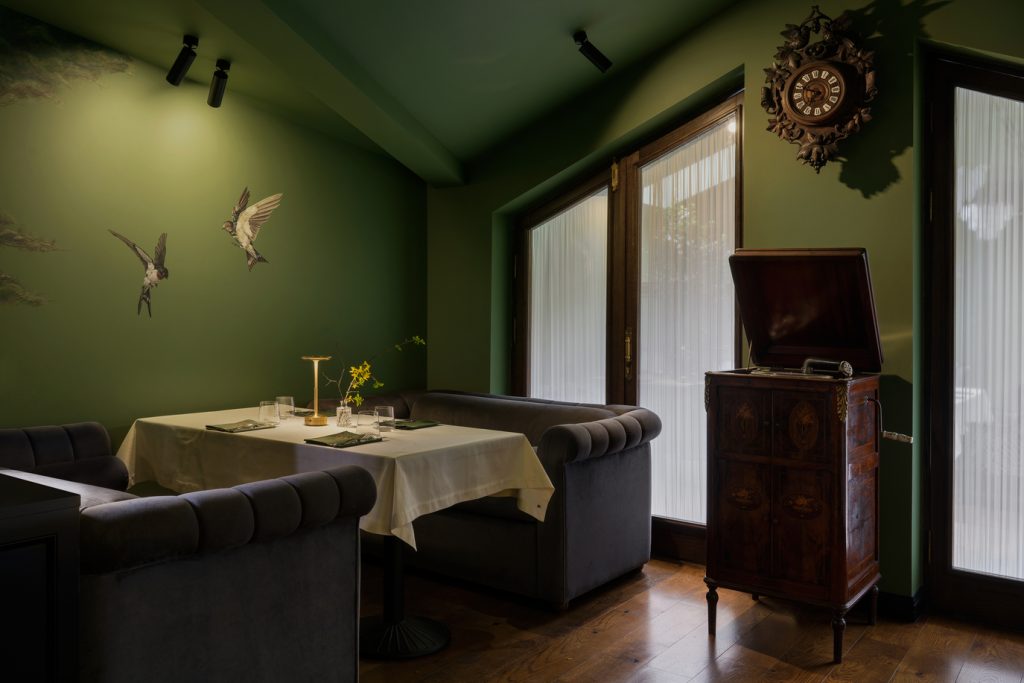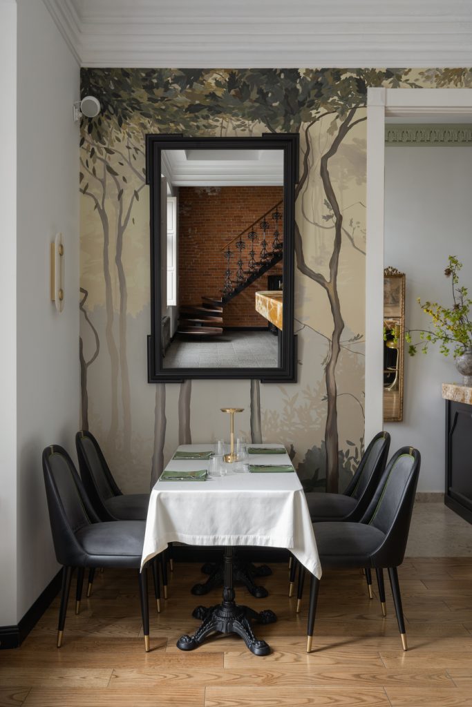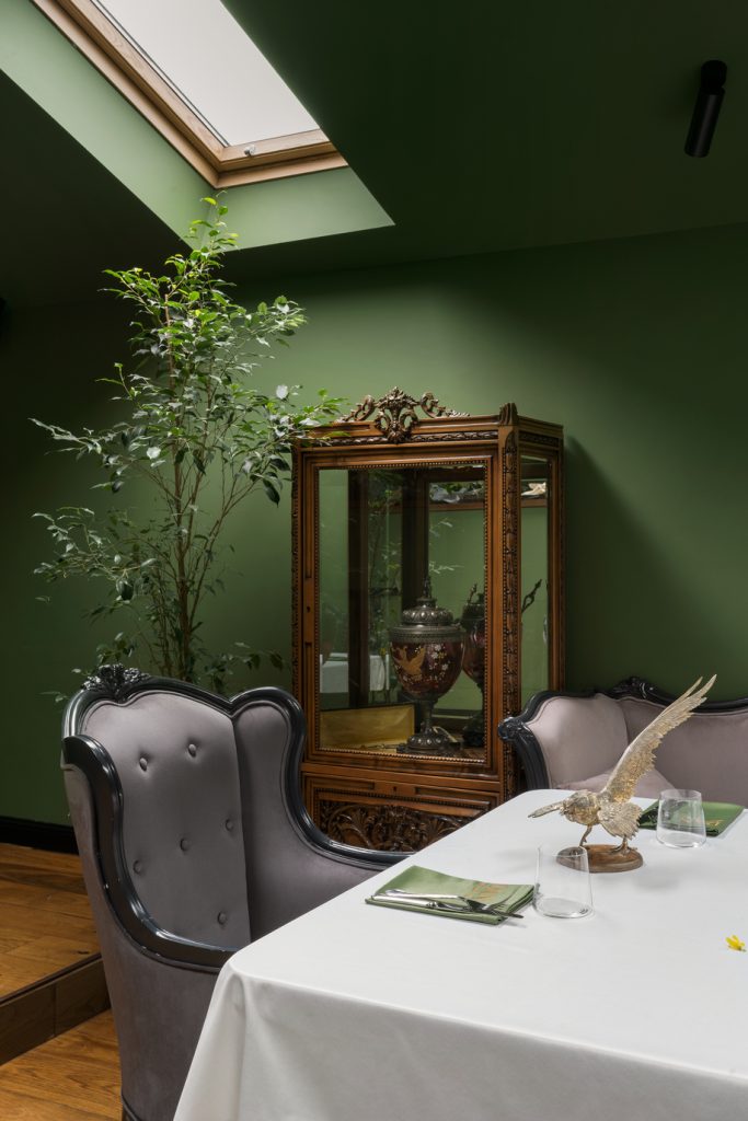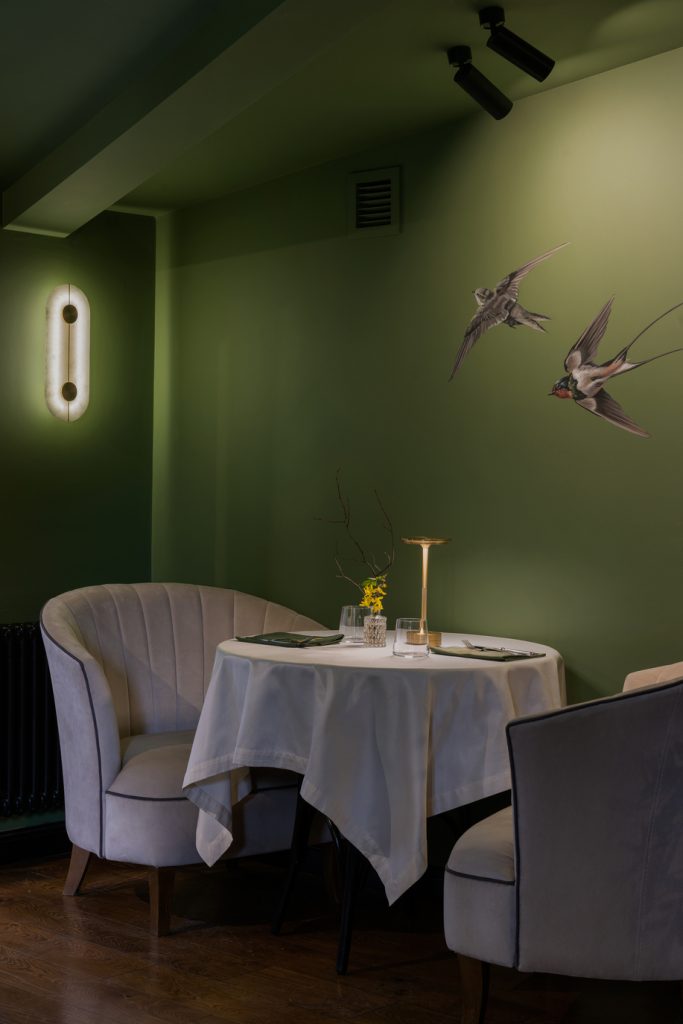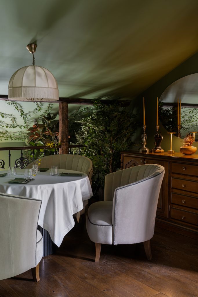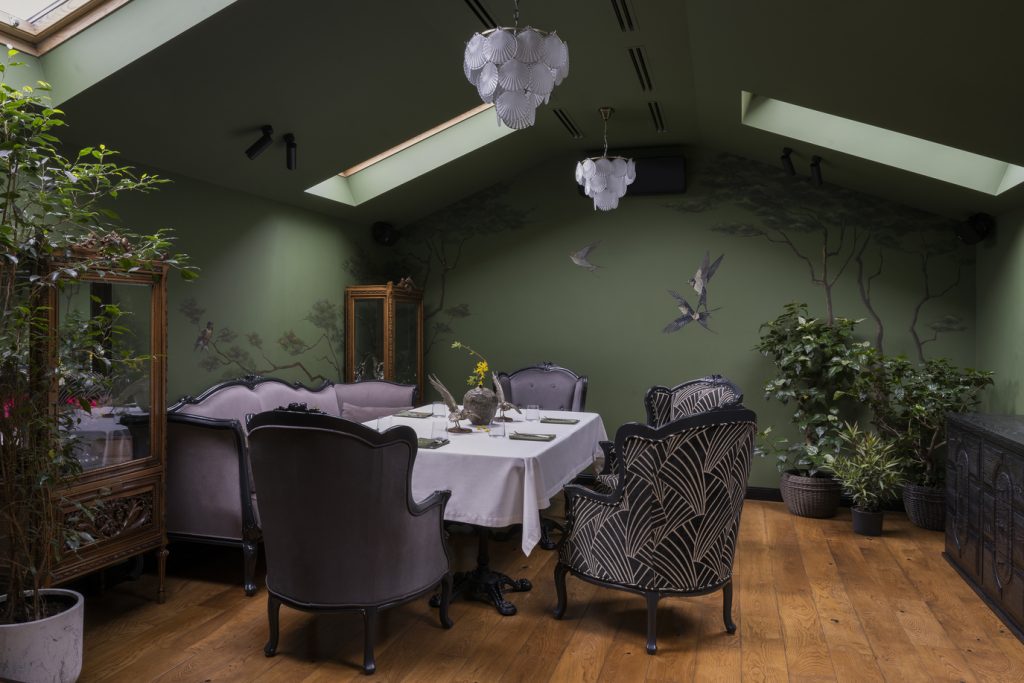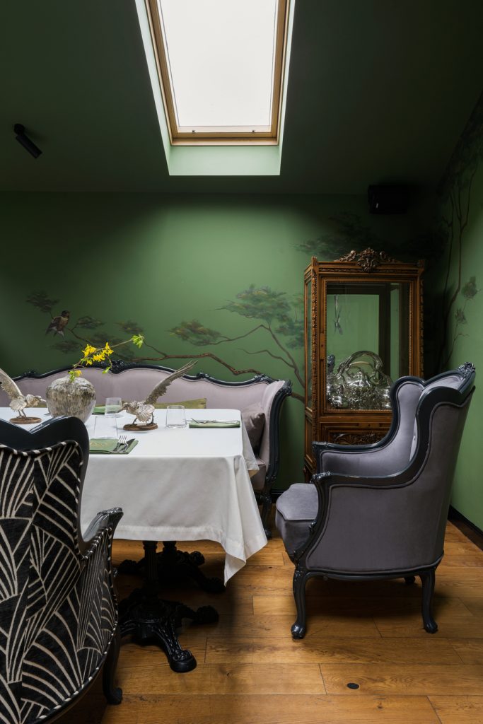 Детали из оникса, словно солнечные всполохи, появляются и в других элементах интерьера, создавая ощущение цельности пространства и добавляя ему притягательности. Ещё один лейтмотив, объединяющий оба этажа, — это птички: их лёгкие силуэты присутствуют и в росписи, и в декоре, и в посуде… Без сомнения, этим щебетуньям очень уютно в райском саду, созданном фантазией дизайнеров. Эту мысль авторам проекта подсказала обстановка ресторана, который ранее размещался в здании: от него осталась большая оранжерея, и теперь она расположилась на втором этаже, дав толчок для воссоздания флористических орнаментов уже в новом интерьере.