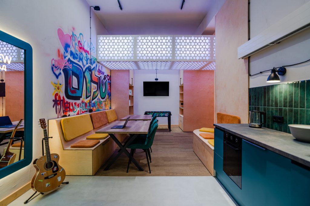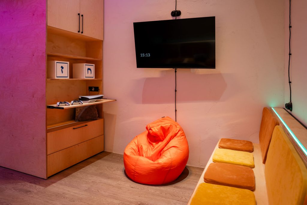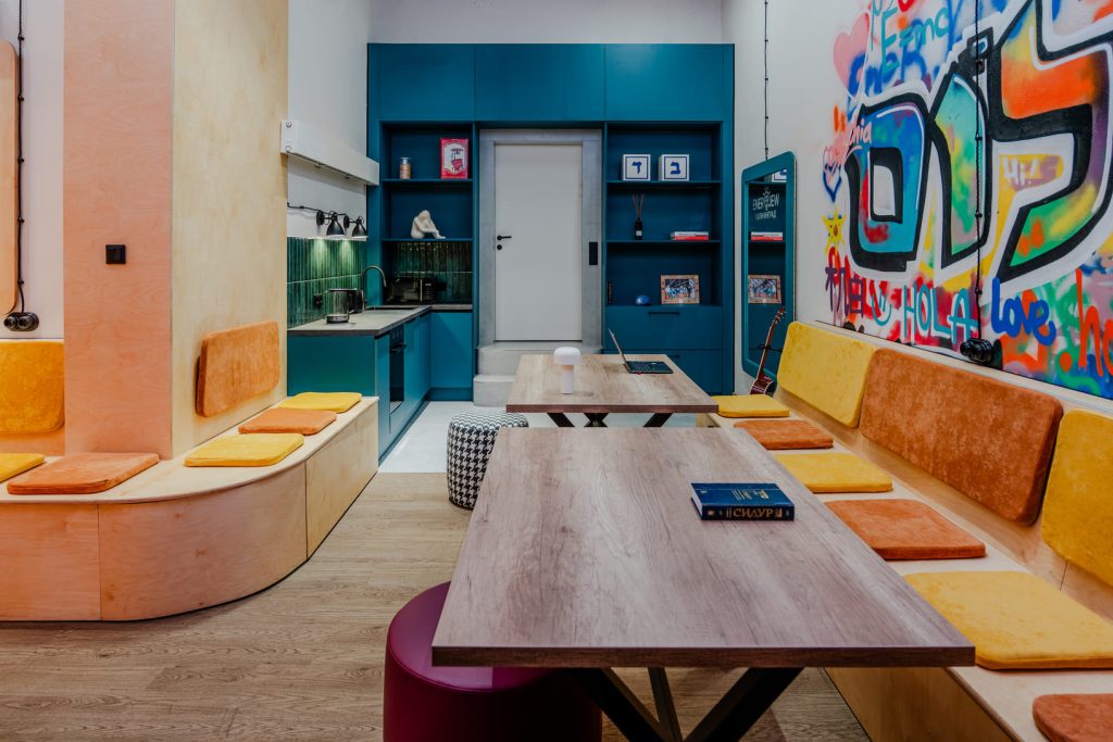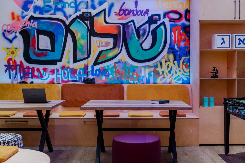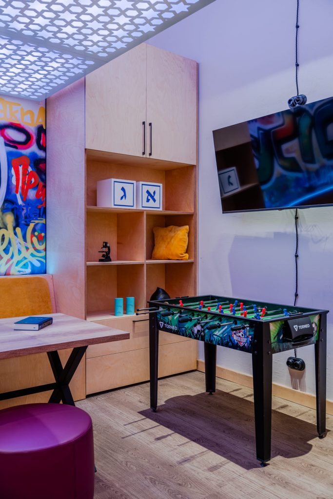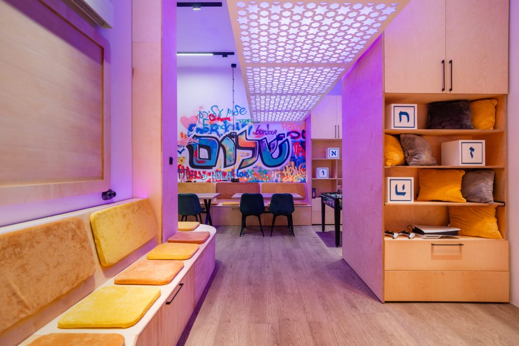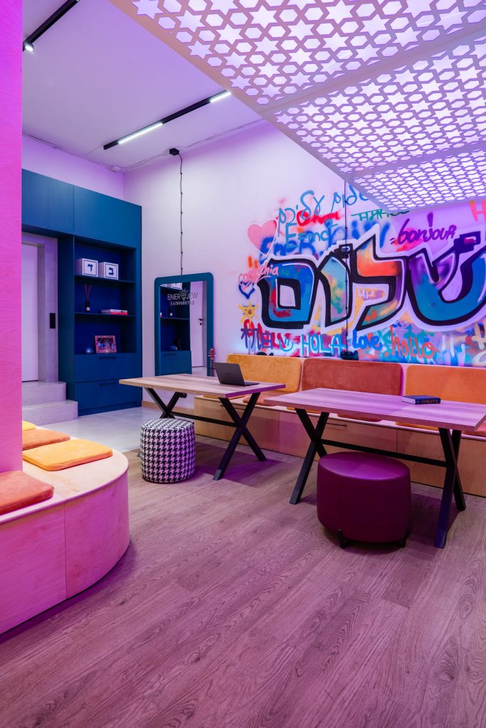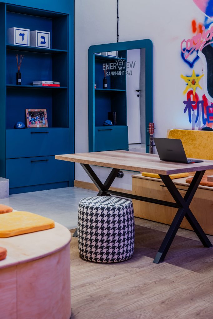 Молодёжную энергетику поддержали двумя интерактивными зонами. На магнитной доске с буквами можно выкладывать цитаты или предложения, а в фотозоне, где есть зеркало с подсветкой и логотипом клуба ENERJEW Kaliningrad, можно сделать эффектные селфи. Самым запомнившимся моментом в рождении этого необычного пространства с ярким характером стало оформление стены, которую ребята своими силами расписали уникальными граффити. Возможность участвовать в создании интерьера и оставить свои «отпечатки» привела их в полный восторг и зарядила пространство позитивными эмоциями!