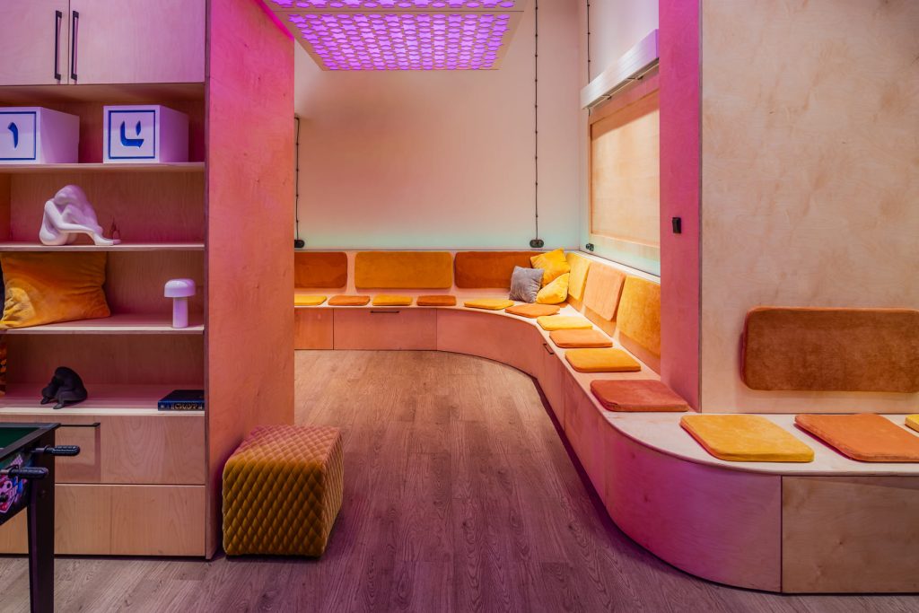 Запрос поступил от раввина калининградской синагоги: здесь имелось подвальное помещение, где функционировал еврейский образовательный молодёжный клуб. Пространство хотели обновить, в том числе и для того, чтобы в нём было комфортно проводить самые разные мероприятия: отмечать национальные праздники и дни рождения членов клуба, организовывать занятия для подростков и юношества и т.д. Поэтому принципиально важно было заложить в интерьер максимальное количество мест для сидения и систем хранения, но без ущерба для комфорта.
