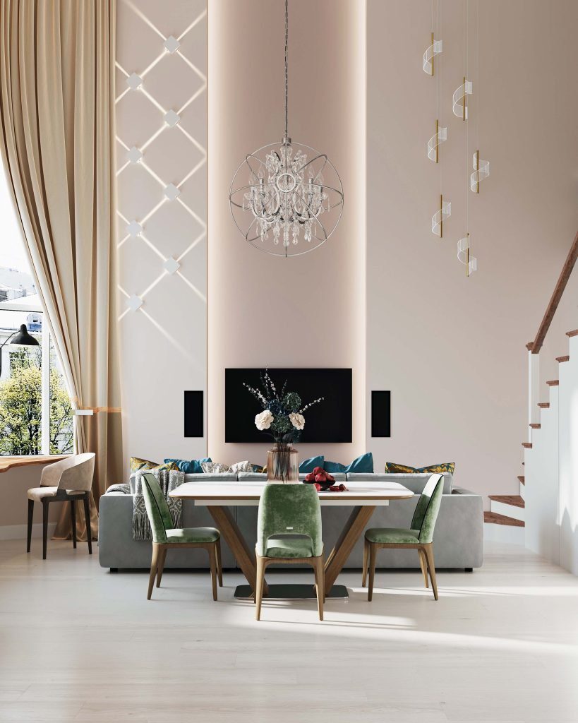 Светлые бархатистые стены плавно пересекаются с блеском хрусталя, а ажурные сеточки светильников играют тенями и наполняют помещение геометрическими узорами.