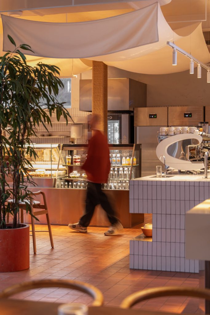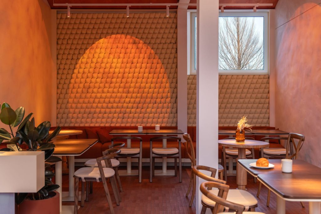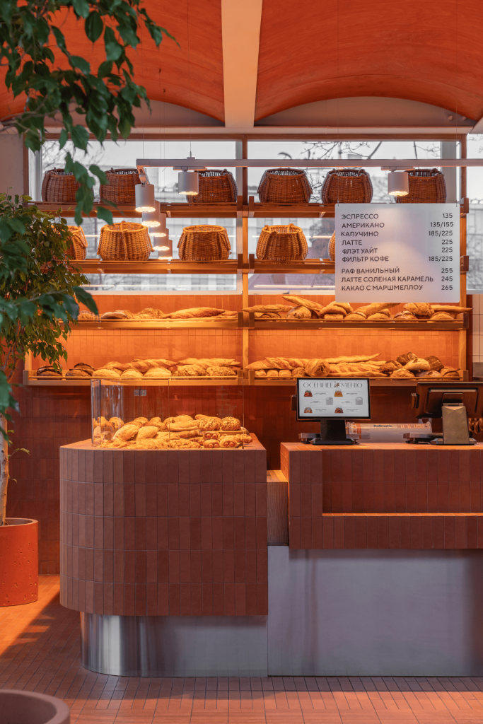 Студия «ЛАЙН ДИЗАЙН» интересно обыграла контекст места. Рядом — старинное немецкое здание. Соседство показалось слишком красивым, чтобы его игнорировать. И дизайнеры поддержали его терракотовой плиткой внутри. Получилось цельно: прошлое и настоящее сошлись в одной цветовой гамме.