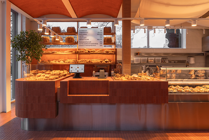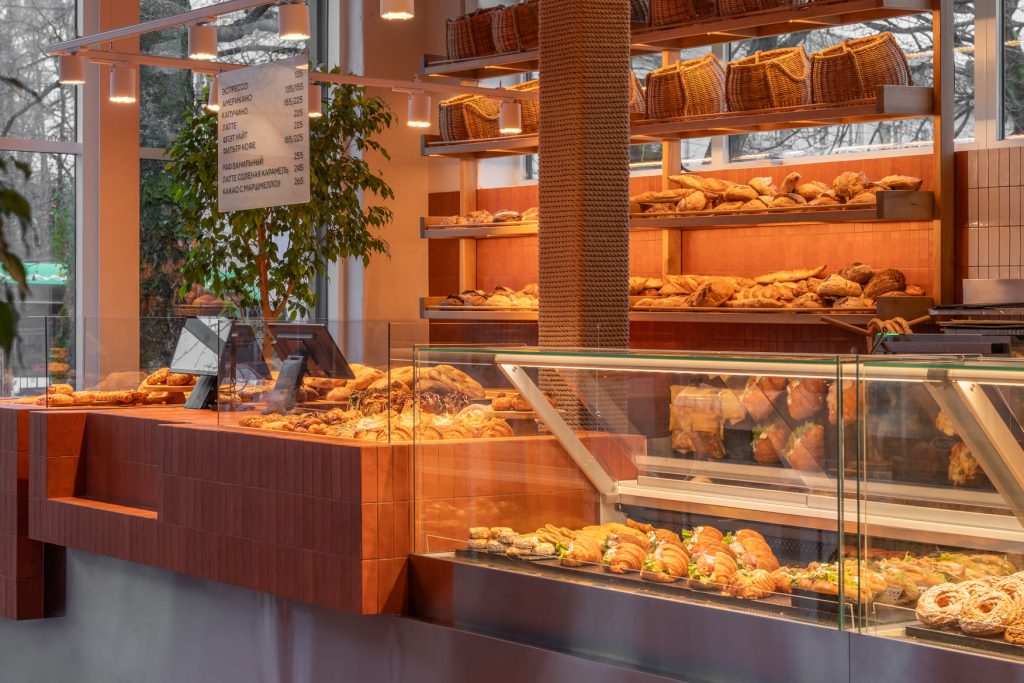 в пекарне комфортным. Витрина у входа — не просто точка продаж, а часть сценария. Аромат хлеба смешивается с визуальным рядом, и ты уже внутри нужного настроения: домашнего, неспешного.