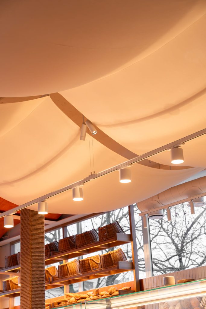 Но главной изюминкой интерьера является потолочное оформление: тканевые полотна создают особое настроение воздуха, визуально расширяя пространство и делая его уютным. Мягкое рассеянное освещение подчёркивает фактуру деревянных поверхностей и позволяет расслабиться, погрузившись в приятную тишину.