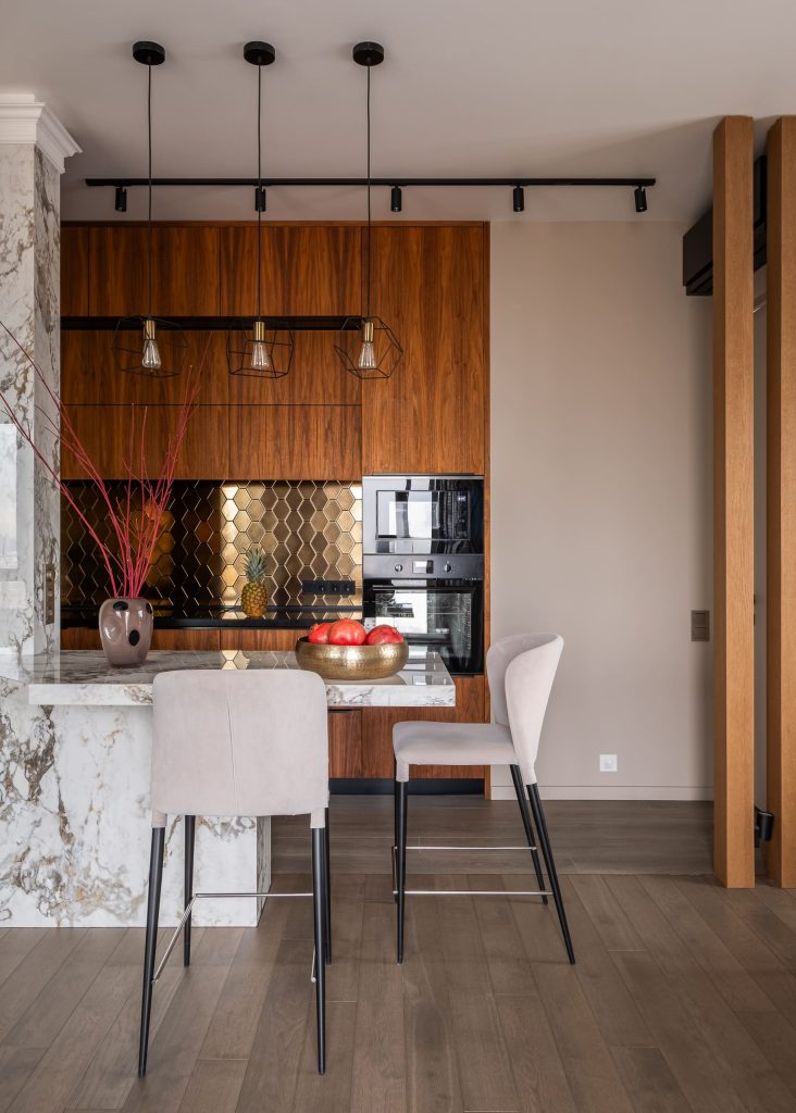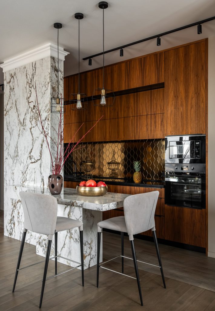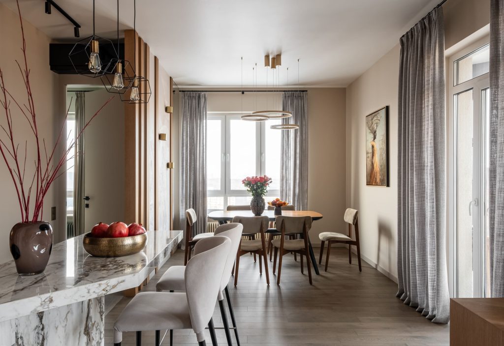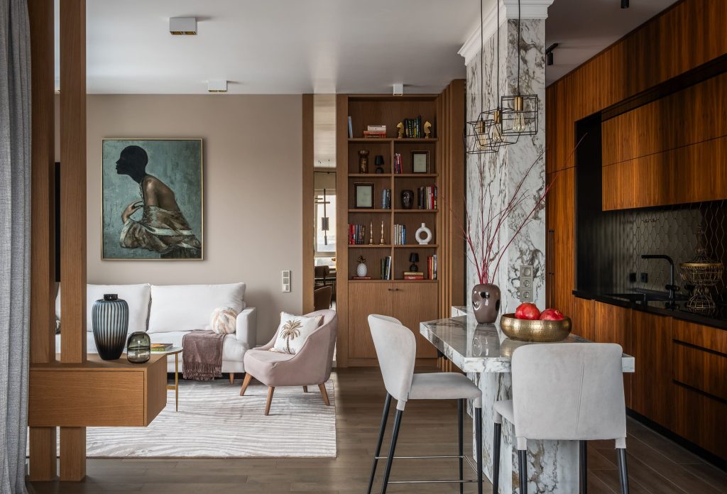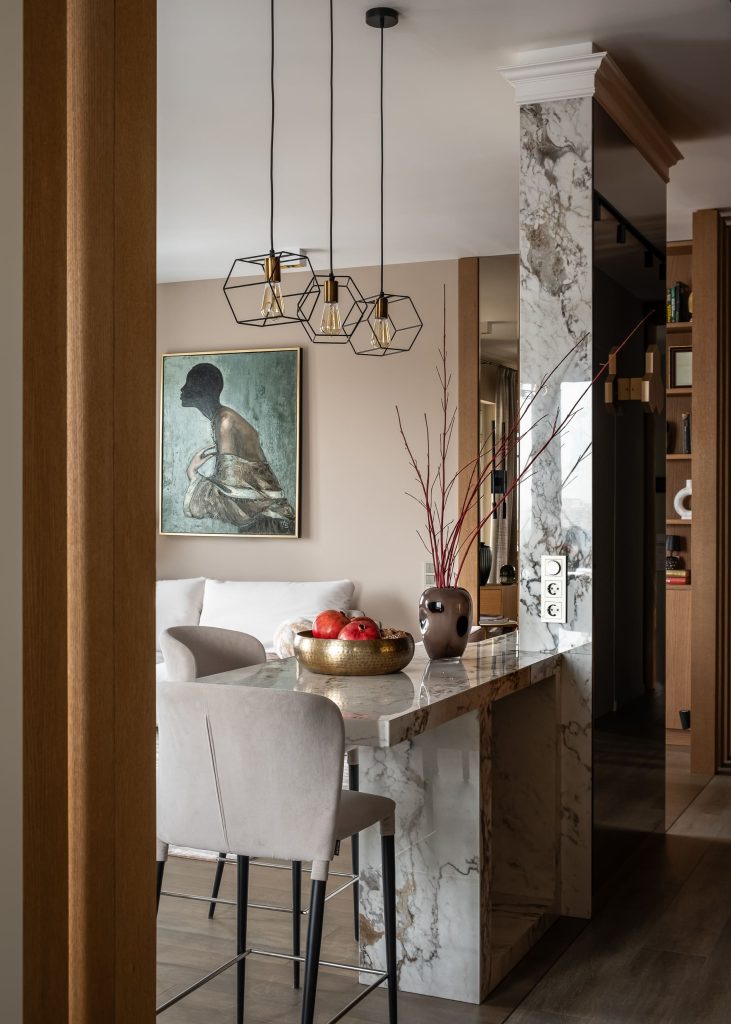 Ещё одно решение было продиктовано необходимостью обыграть несущую конструкцию в зоне кухни: здесь появился кухонный остров с великолепной мраморной фактурой, также связывающей интерьер с природной темой. В итоге вынужденная мера обернулась тем, что именно пилон стал стержнем пространства, местом притяжения семьи и гостей, любимым уголком хозяев, по их словам. К тому же конструкция визуально разделяет части общественной зоны, структурируя её и добавляя игры объёмов.