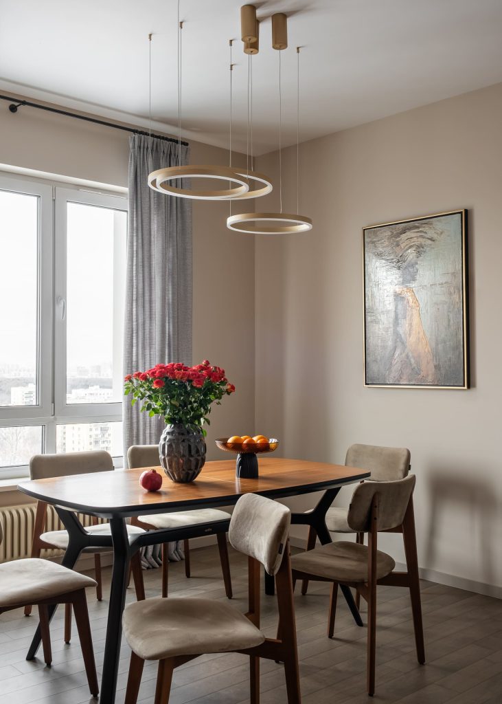 Это обстоятельство продиктовало и планировочную концепцию: владельцы мечтали о просторной общественной зоне, доминантой которой станет вид из окна. Осуществить задумку оказалось не очень легко: кухня находилась в другой части квартиры. Но вдумчивый подход, всесторонний анализ пространства и нестандартное мышление позволили авторам проекта решить эту задачу: кухня переехала в зону коридора. Все согласования были пройдены, и таким образом выстроилось интересное, нестандартное, многоплановое пространство, от которого владельцы пришли в восторг. Зона гостиной-кухни-столовой получилась очень просторной — около 40 квадратов, наполнилась воздухом и светом, обрела особую теплоту и связь с природой.