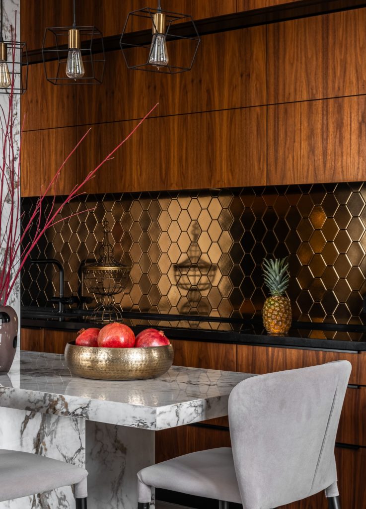 Взаимопонимание в плане колористики у дизайнеров и владельцев сложилось не сразу. «Мы пригласили заказчиков в салон отделочных материалов, чтобы презентовать концепцию кухни-гостиной, — рассказывает Анна Гусарова. — И я показала им золотую плитку в форме ромба для кухонного фартука. Она ассоциируется у меня с осенней листвой, и я в неё влюбилась сразу, как увидела! Когда я показывала клиентам сочетания плитки с другими материалами, у меня, видимо, так горели глаза, что мой энтузиазм оказался заразителен!»
