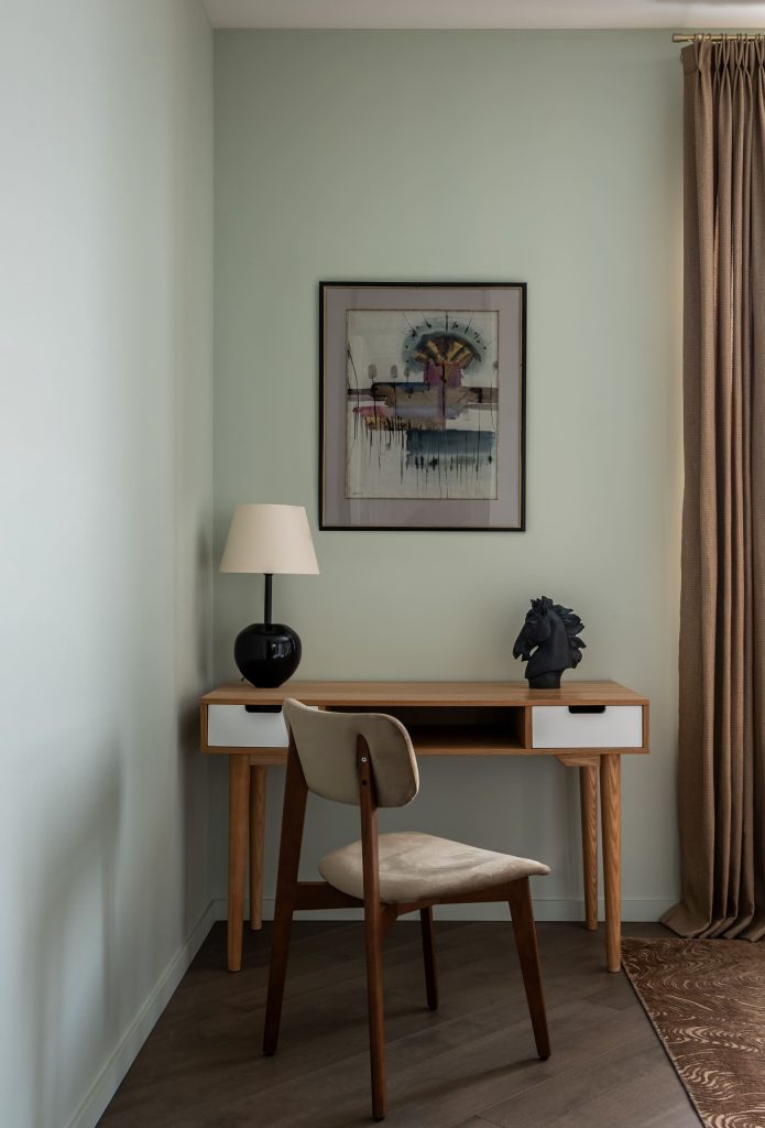Тональность проекта определил изумительный вид за окном: парк, где, как на огромной палитре, смешиваются в разные сезоны множество оттенков, никогда не может наскучить.