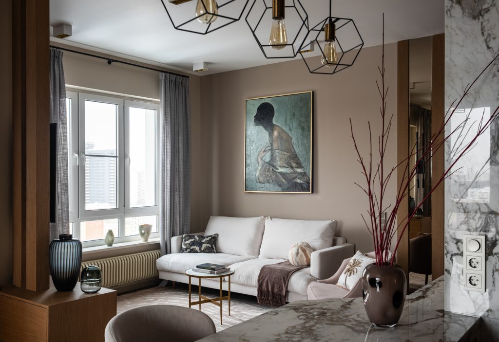 Ещё одно решение было продиктовано необходимостью обыграть несущую конструкцию в зоне кухни: здесь появился кухонный остров с великолепной мраморной фактурой, также связывающей интерьер с природной темой. В итоге вынужденная мера обернулась тем, что именно пилон стал стержнем пространства, местом притяжения семьи и гостей, любимым уголком хозяев, по их словам. К тому же конструкция визуально разделяет части общественной зоны, структурируя её и добавляя игры объёмов.