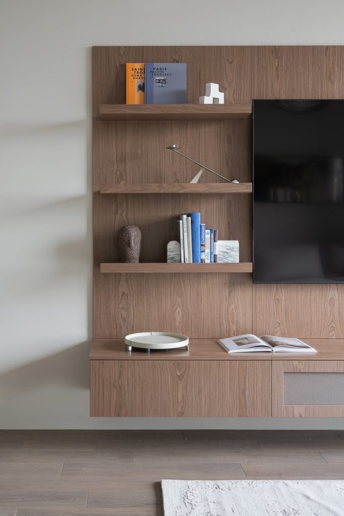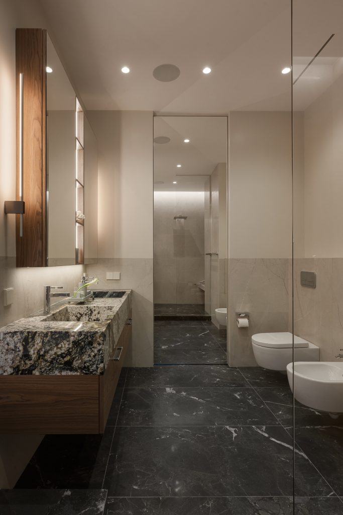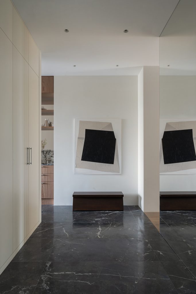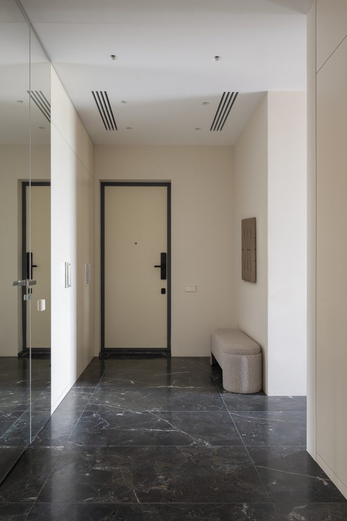 Гибкость пространства отнюдь не исключает бескомпромиссного подхода к деталям, обеспечивающим комфорт. Безукоризненная инженерия, домашний кинотеатр, профессиональная аудиосистема, многоступенчатая система очистки и умягчения воды, интеграция в систему вентиляции сушильного шкафа — Анастасия Яровая предусмотрела всё, что делает интерьер продуманным и функциональным. В том числе дизайнер спроектировала три полноценные гардеробные комнаты и встроенные шкафы во всех возможных нишах: это избавляет минималистичный интерьер от визуального шума.