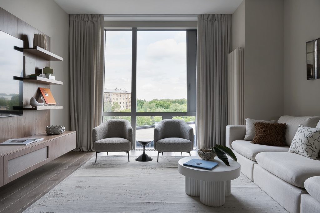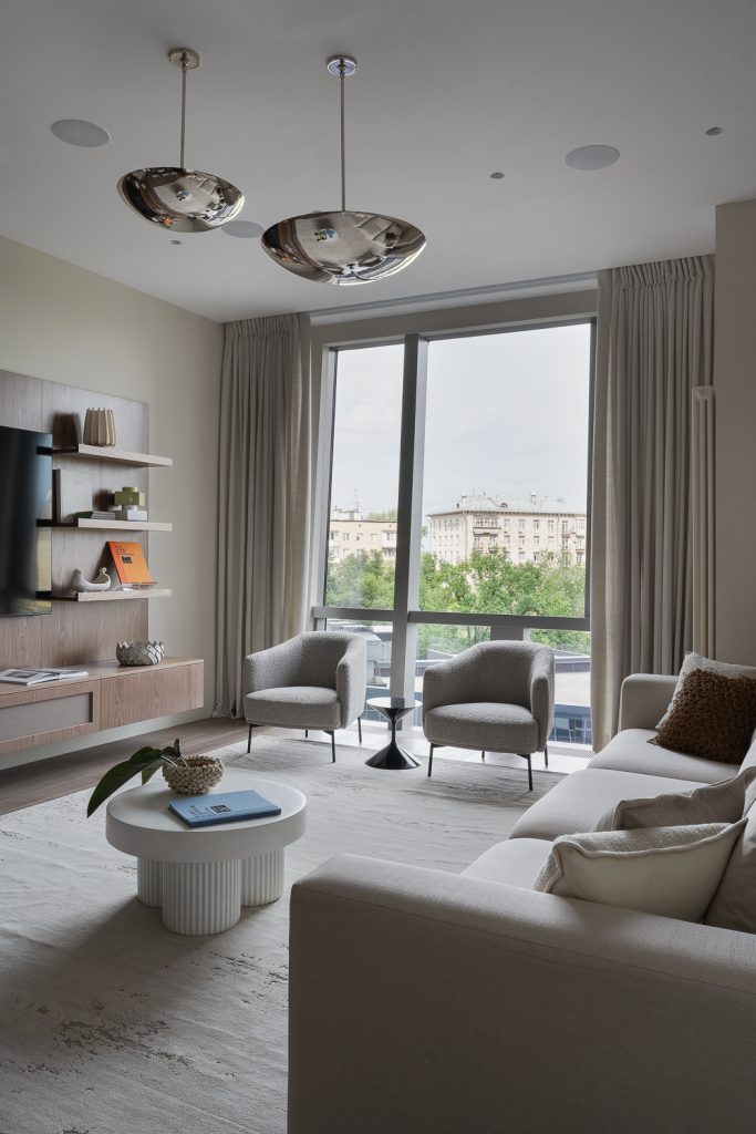 Точкой роста будущего интерьера стал вид из панорамных окон на киностудию «Мосфильм» и зелёный массив: пространство явилось органичным продолжением городской панорамы, где есть теплота, воздух, свет, биение жизни.