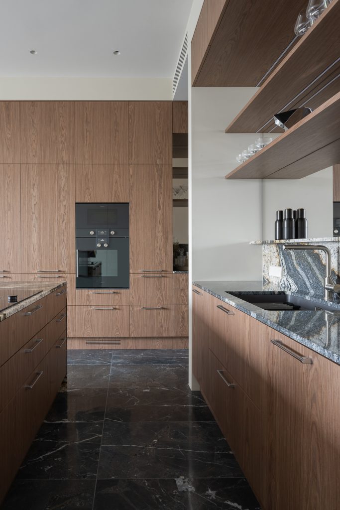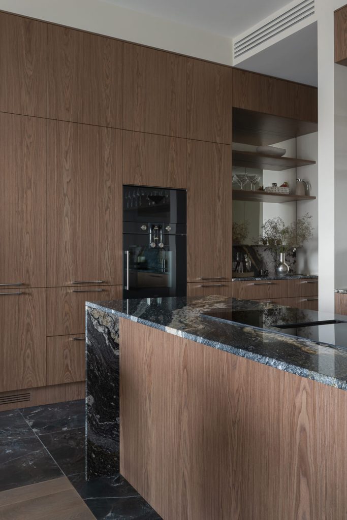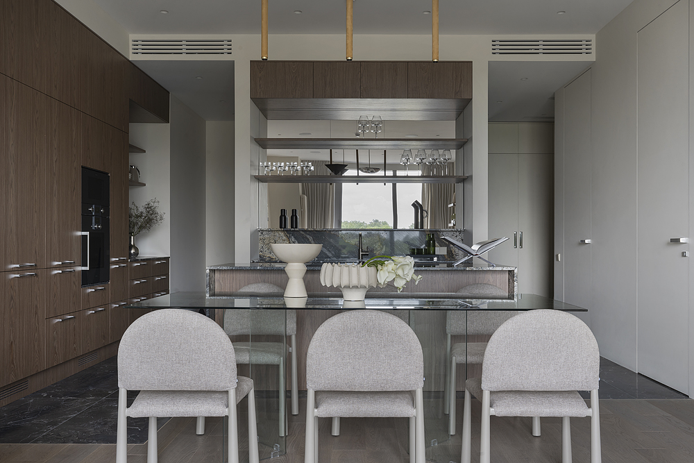 В квартире, площадь которой составляет 187 кв. м, кухня обязана быть просторной и функциональной, но не выглядеть перегруженной. На помощь пришли ниши, где разместили большую часть кухни и системы хранения, а также зеркальные поверхности, визуально увеличивающие пространство.