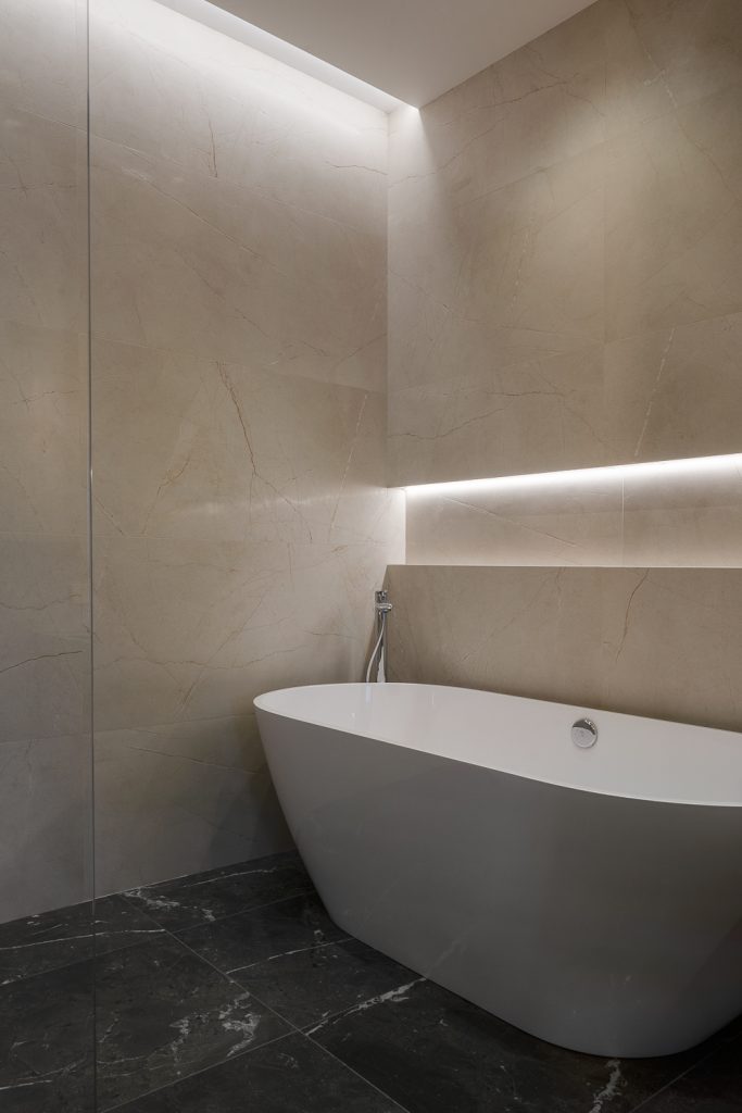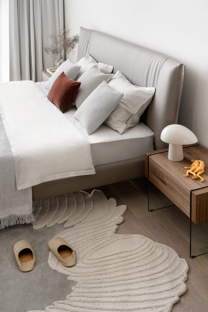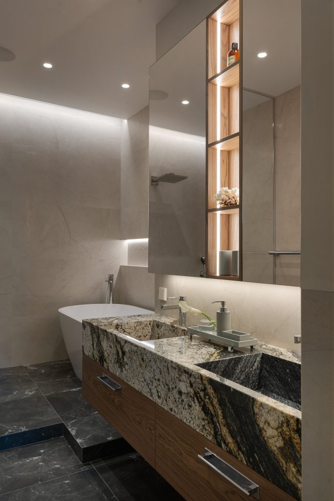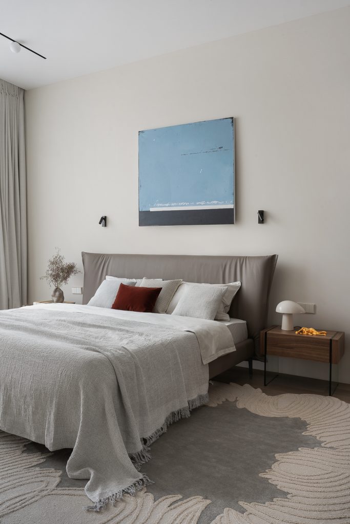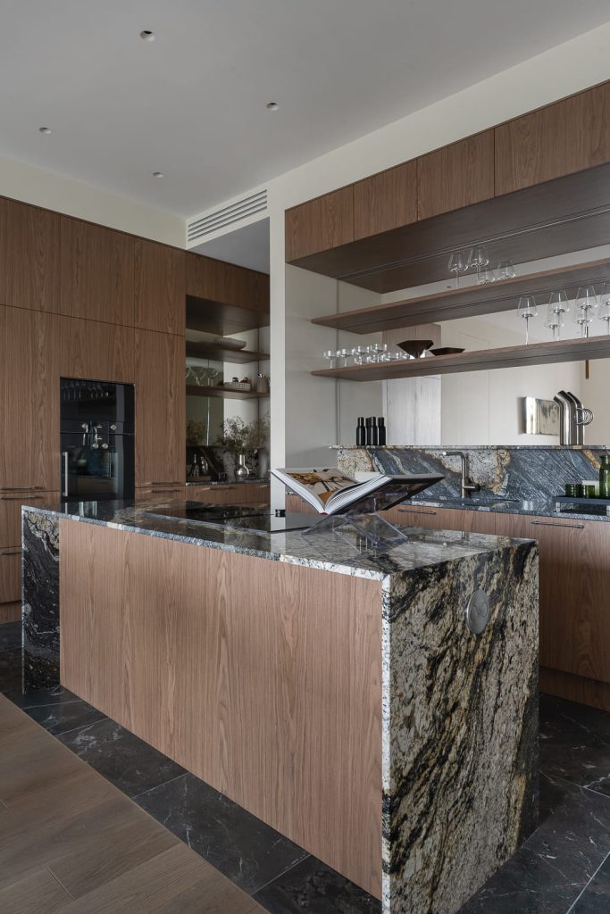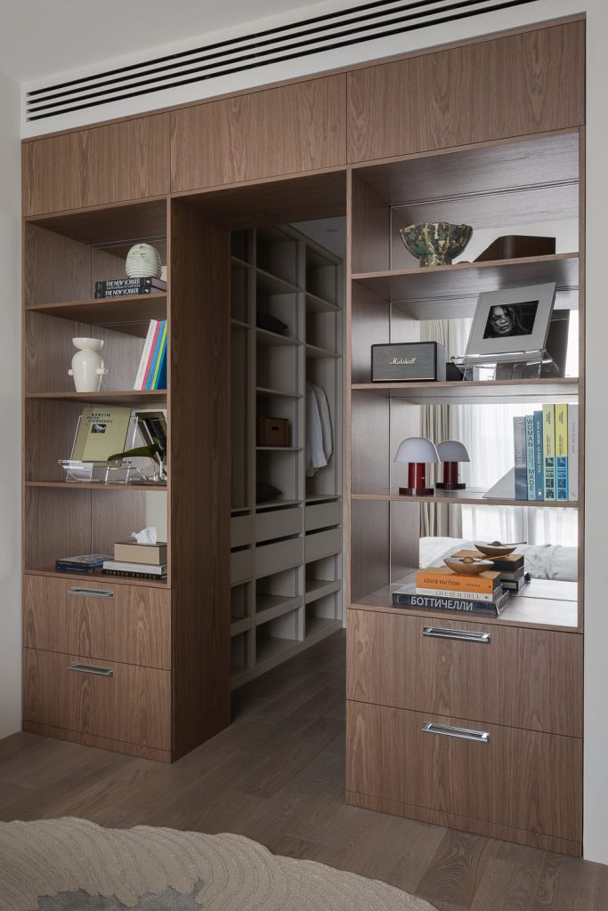 «Я сознательно выбрала нейтральную палитру — бежевые и серые оттенки, натуральное дерево, камень с яркой фактурой, — объясняет автор проекта. — Здесь не стояло задачи удивлять — хотелось создать атмосферу сдержанной, тихой роскоши, где материалы, текстуры и детали говорят сами за себя. В спальне стеллажи и открытые полки сделают пространство очень личным, когда здесь появятся любимые книги, фотографии и памятные предметы из путешествий».