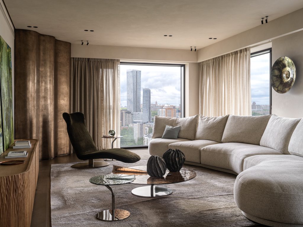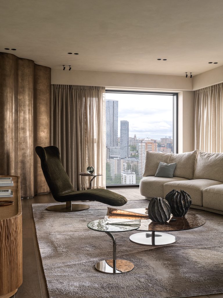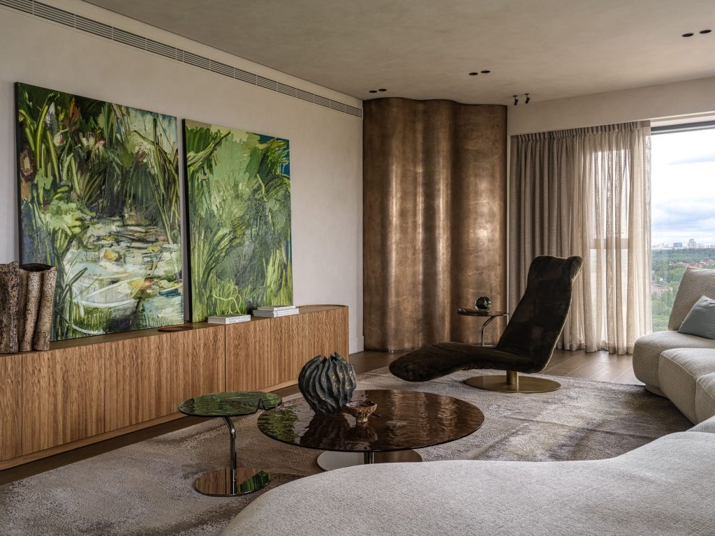 Особенность гостиной — выступающий ступенькой угол — обыграли в русле общей концепции, закрыв его волнообразной конструкцией в отделке жидким металлом. Свет из панорамных окон, скользя по плавным линиям, добавляет интерьеру динамики и подчёркивает красоту благородной текстуры. И в целом Юлия Данилова-Нитусова и Анастасия Король делают ставку на фактурное многоголосье при общей лаконичности пространства. Кресло с бархатистой обивкой, рифлёная поверхность столиков, напоминающих лист кувшинки, фасады комода, по которым хочется провести рукой, как по стволу дерева, — все эти детали помогают заземлиться, ощутить природную гармонию и спокойствие.