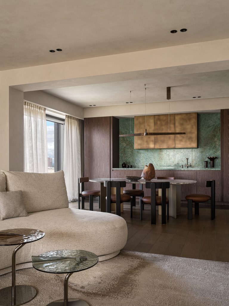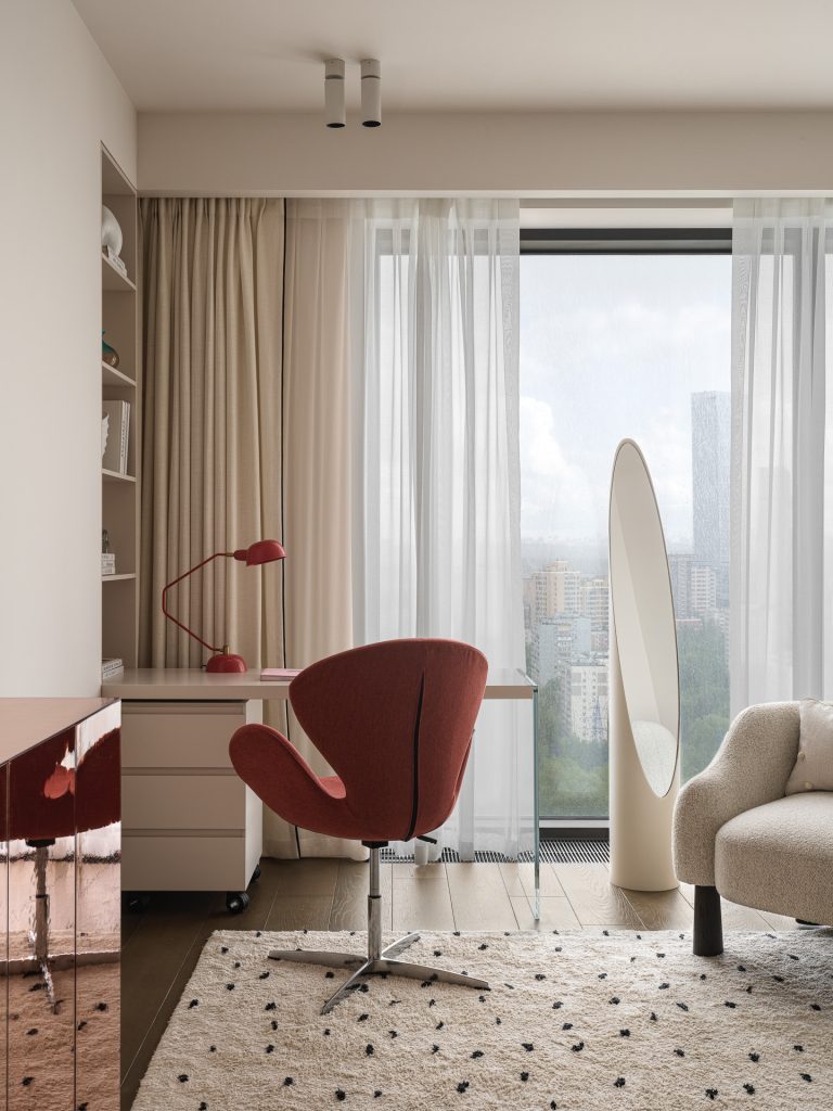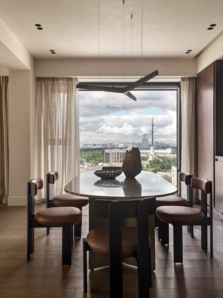 С шестнадцатого этажа дома-новостройки открывается впечатляющий вид на город, но, по контрасту с окружающей урбанистической средой, владельцы хотели получить пространство, где всё будет дышать спокойствием, умиротворением, благородством и глубиной. С работами Юлии Даниловой-Нитусовой и Анастасии Король они познакомились через Интернет, просмотрев видео одного из реализованных проектов, и поняли, что именно эта команда сумеет создать многослойный, проработанный интерьер, где каждая деталь будет нести особый смысл и отличаться безупречным качеством.