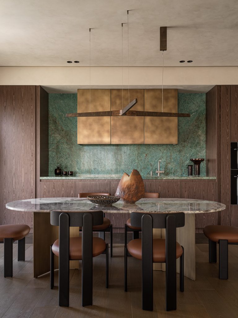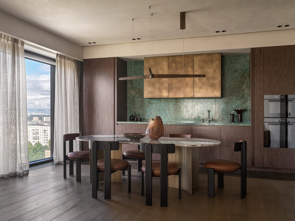 Ансамбль кухни-столовой — фасады в отделке натуральным шпоном, фартук, столешница из мрамора, большой обеденный стол, также со столешницей из натурального мрамора и металлическим подстольем — продолжает взятую тональность и при этом радует функциональностью и продуманностью.