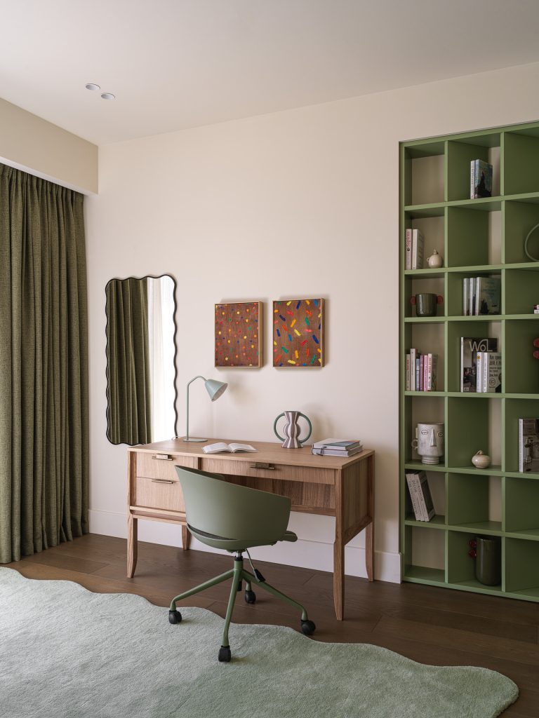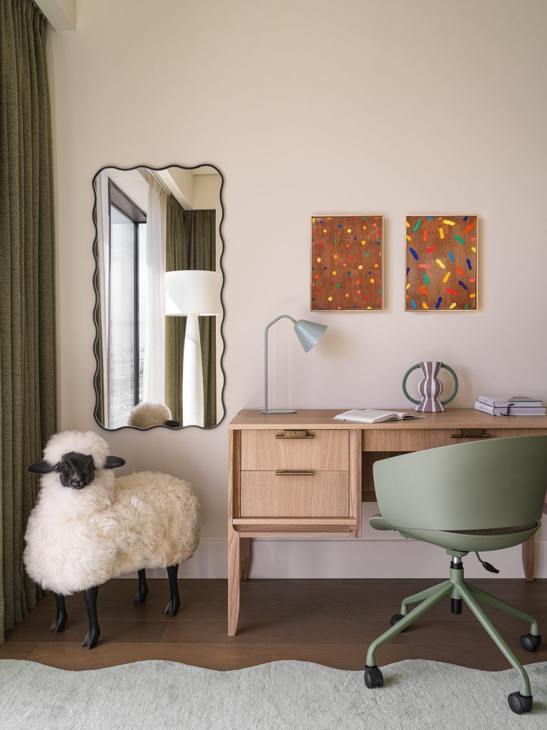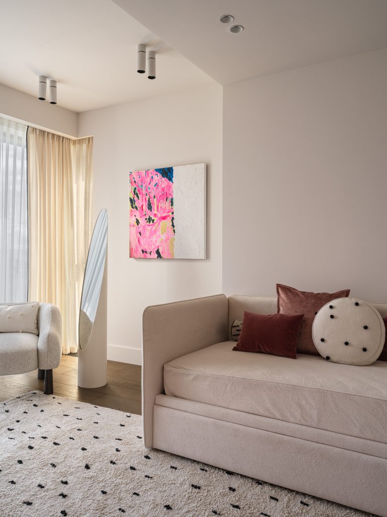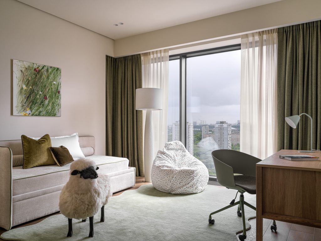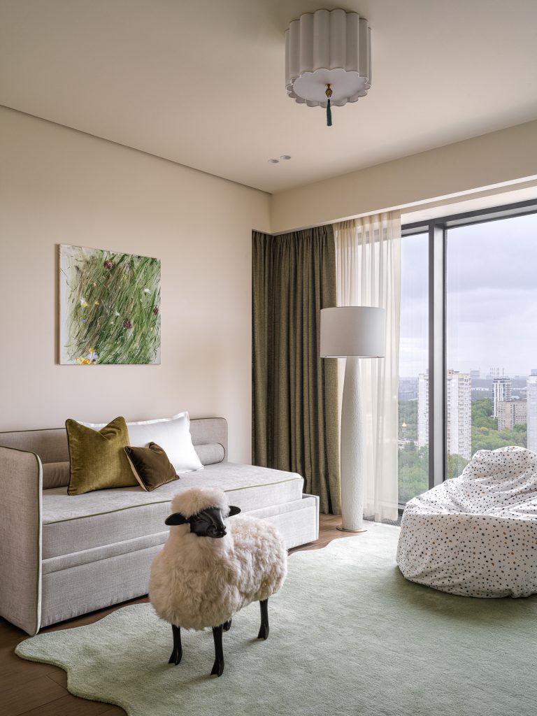 В детских настроение определяют дружелюбные приглушённые оттенки, которые обеспечивают психологический комфорт. В каждой комнате предусмотрели зону отдыха, рабочий уголок, место для сна и хранения вещей; кроме того, здесь есть собственные гардеробные. Отметим, что дизайнеры по максимуму использовали все возможности помещений квартиры, смонтировав встроенные закрытые системы хранения. Большая их часть расположилась в коридорах и гардеробной мастер-блока, а в холле появился стильный шкаф с фасадами из шпона под матовым лаком. Все системы хранения были сделаны на заказ проверенным подрядчиком и разработаны индивидуально, специально для этого проекта.