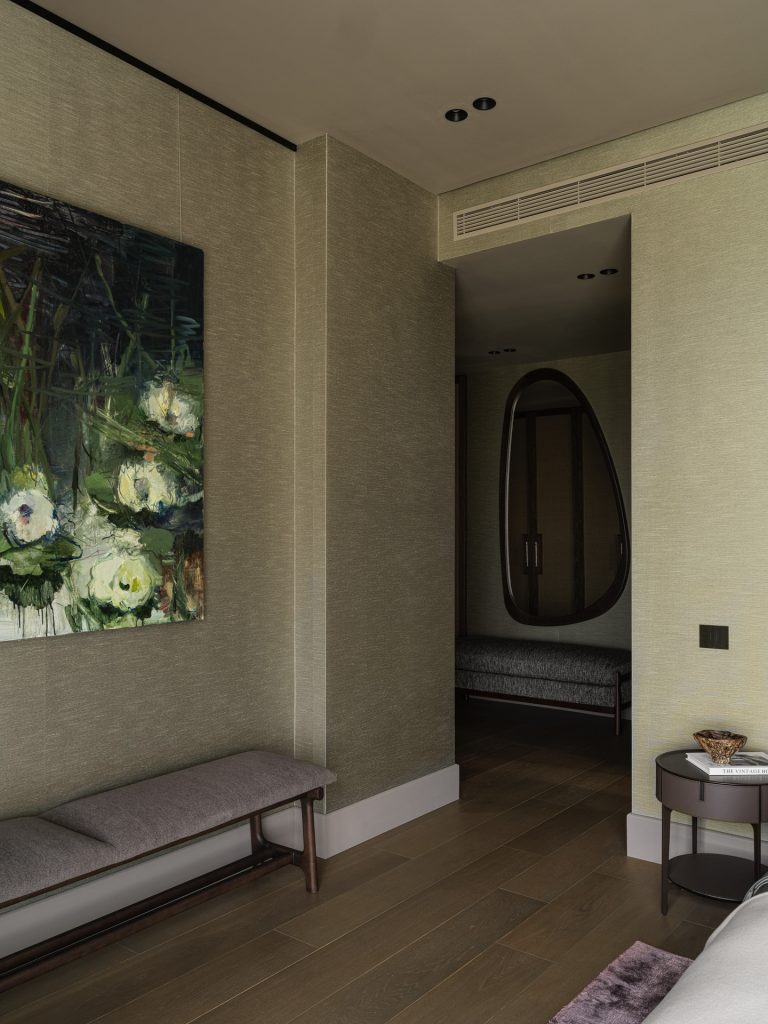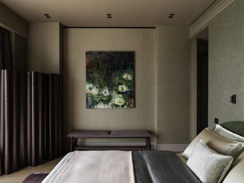 В комнате и гардеробной на потолке применили достаточно глубокий оттенок краски, а для стен выбрали в этом же тоне обои из натурального шёлка и хлопка. Такое решение создаёт эффект шкатулки, рождает особую камерность, дарит окутывающую мягкость. Особую роль в спокойном сдержанном пространстве приобретает арт: на фоне естественных, природных оттенков живописное полотно с изображением кувшинок становится выразительным фокусным элементом.