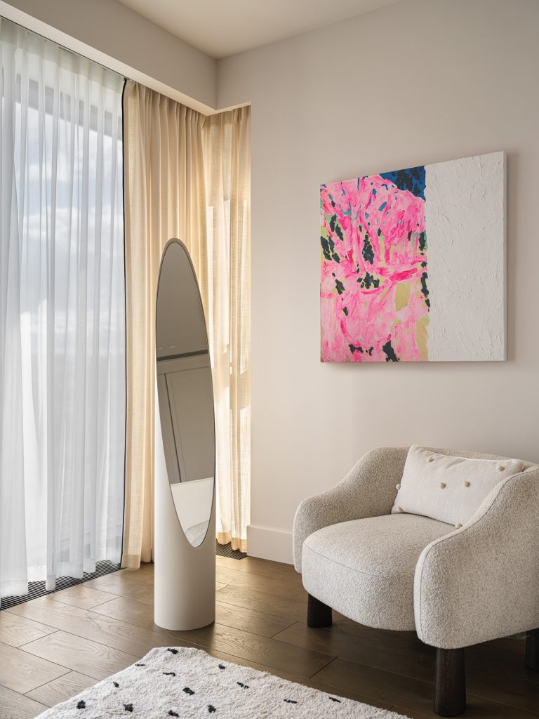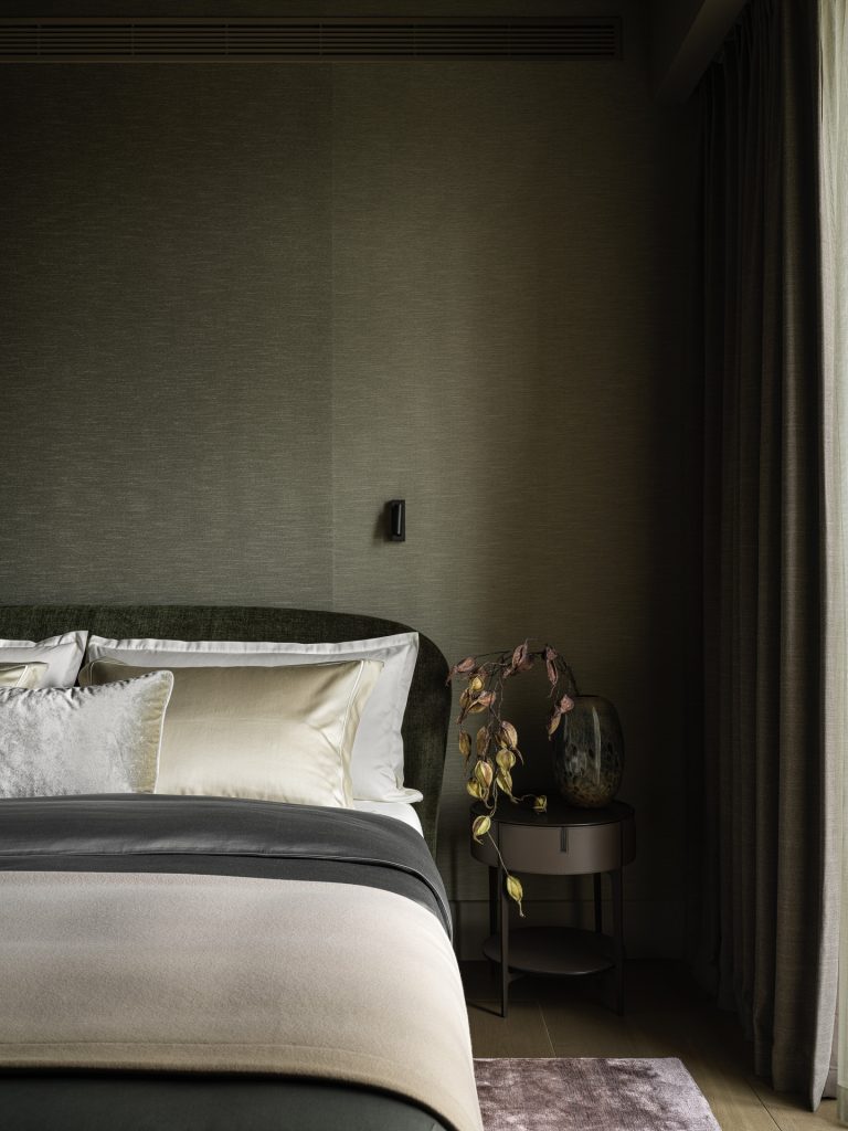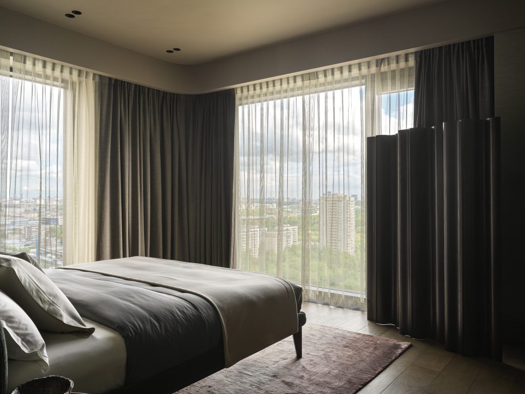 В мастер-спальне идею с волнообразной конструкцией повторили, использовав ширму из коллекции икон дизайна в современной интерпретации от Alivar. Вечером, когда шторы задёрнуты, ширма словно вырастает из их складок, делая пространство объёмным и многоплановым.
