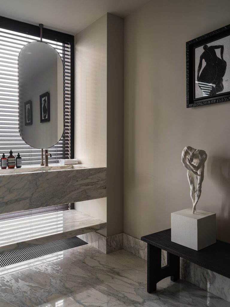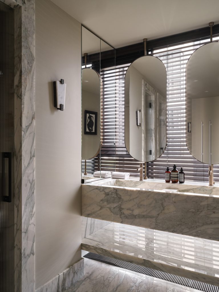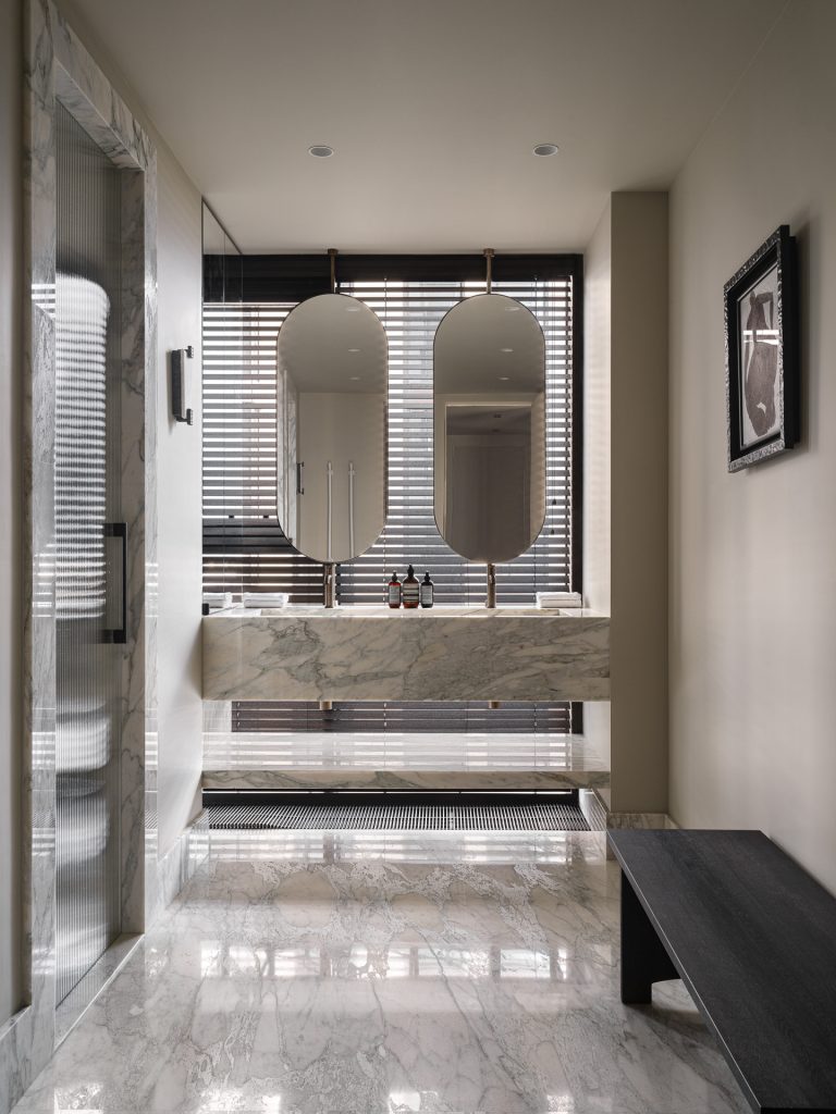 Санузлы подверглись полной реконструкции. В мастер-ванной пространство разделилось на две зоны: приватную и общую. Стены оформили светлым натуральным мрамором — это незаменимый материал для создания элегантного премиального интерьера. Ванну, которая располагалась напротив входа, демонтировали, и на этом месте появилась столешница с раковинами и зеркалами на поворотном механизме.