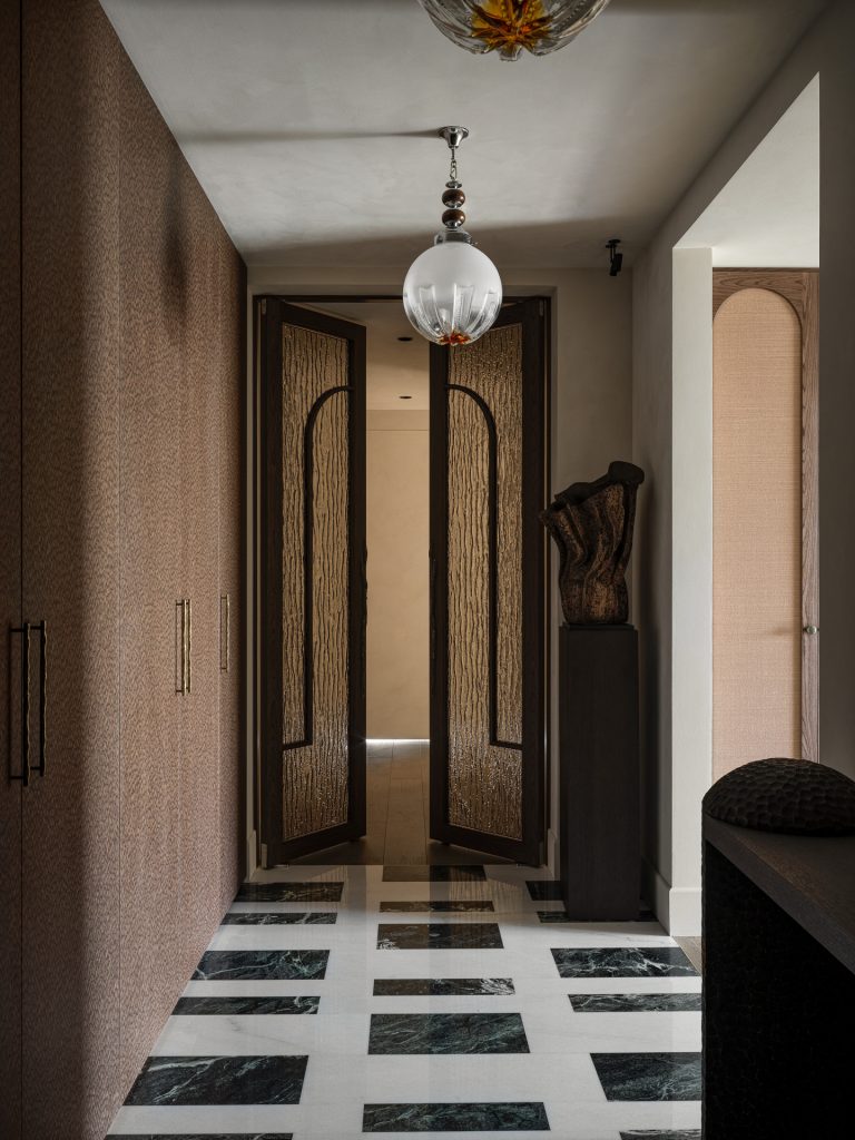 В прихожей было решено демонтировать пол от застройщика, заменив его на натуральный мрамор. Раскладку также выполнили по уникальному эскизу — такое оформление сделало геометрию коридора интереснее и добавило парадные ноты, формирующие первое впечатление у входящего в дом.