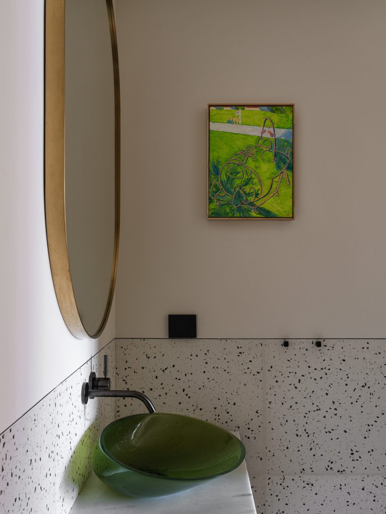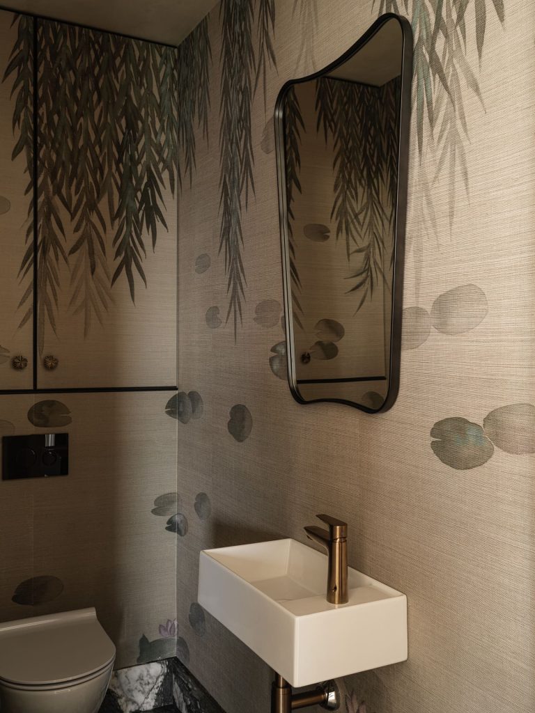 В гостевом санузле пол оформили натуральным камнем красивого тона, а для отделки стен использовали натуральные обои из сизаля. Фактурное полотно радует своей экологичностью и уникальной текстурой, отлично дополняя стилистику пространства.