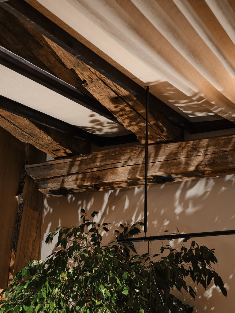 «Мы часто закладываем в интерьер предметы из исторических материалов. Так в этом проекте появились резные деревянные балки на потолке, которые когда-то были частью старой конюшни в окресностях Кёнигсберга начала XX века. Мы сохранили их патину, текстуру, дефекты и прожилки — всё, что делает дерево живым», — рассказывают авторы проекта.