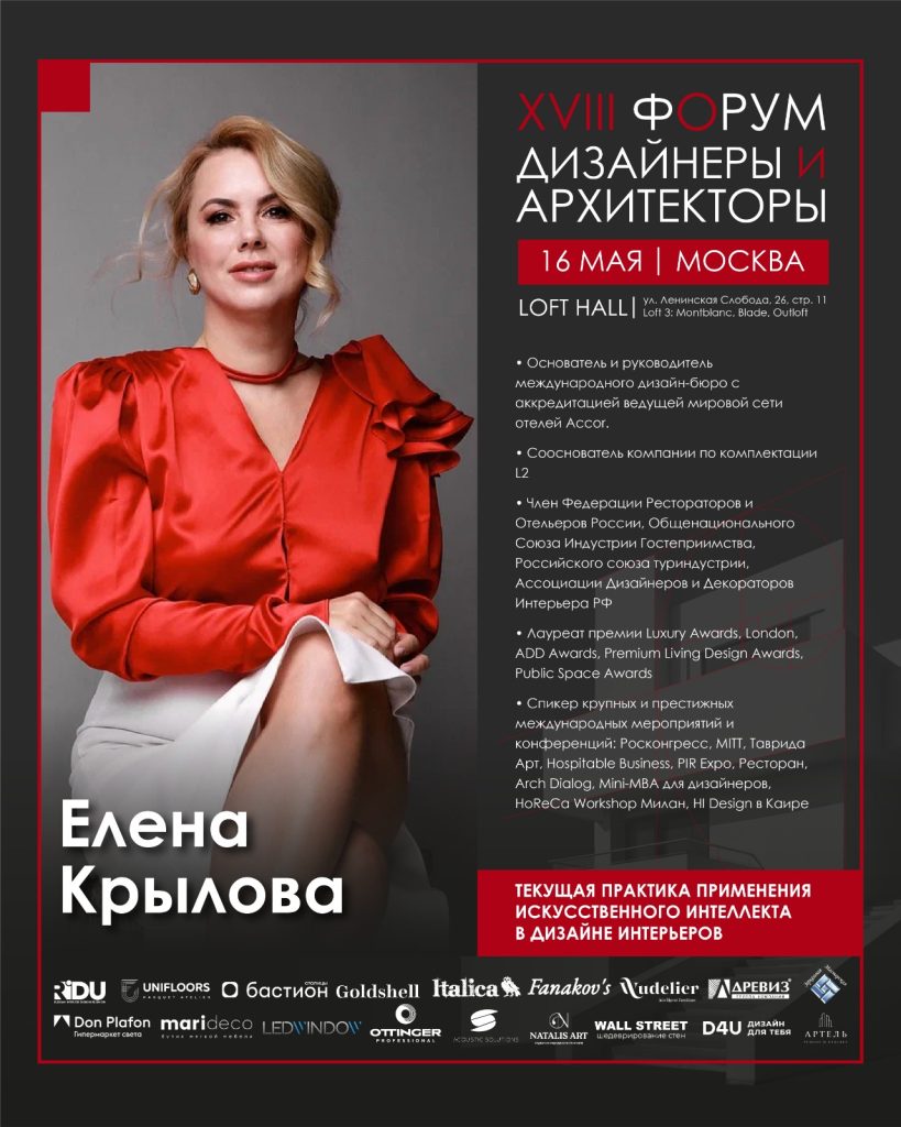 - Елена Крылова: поделится опытом применения искусственного интеллекта в дизайне интерьеров, раскрывая новые технологии и их возможности для дизайнеров.