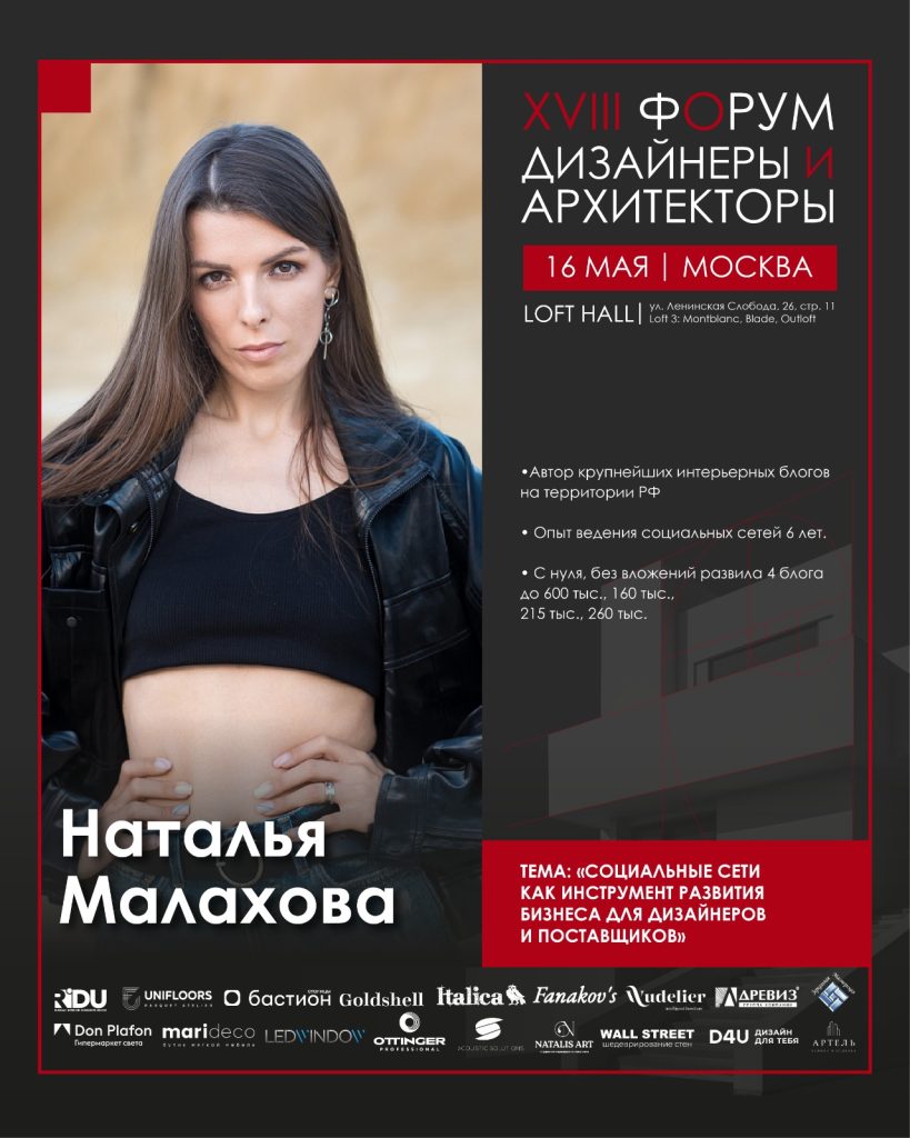 - Наталья Малахова раскроет актуальную тему: «Социальные сети как инструмент развития бизнеса для дизайнеров и поставщиков».