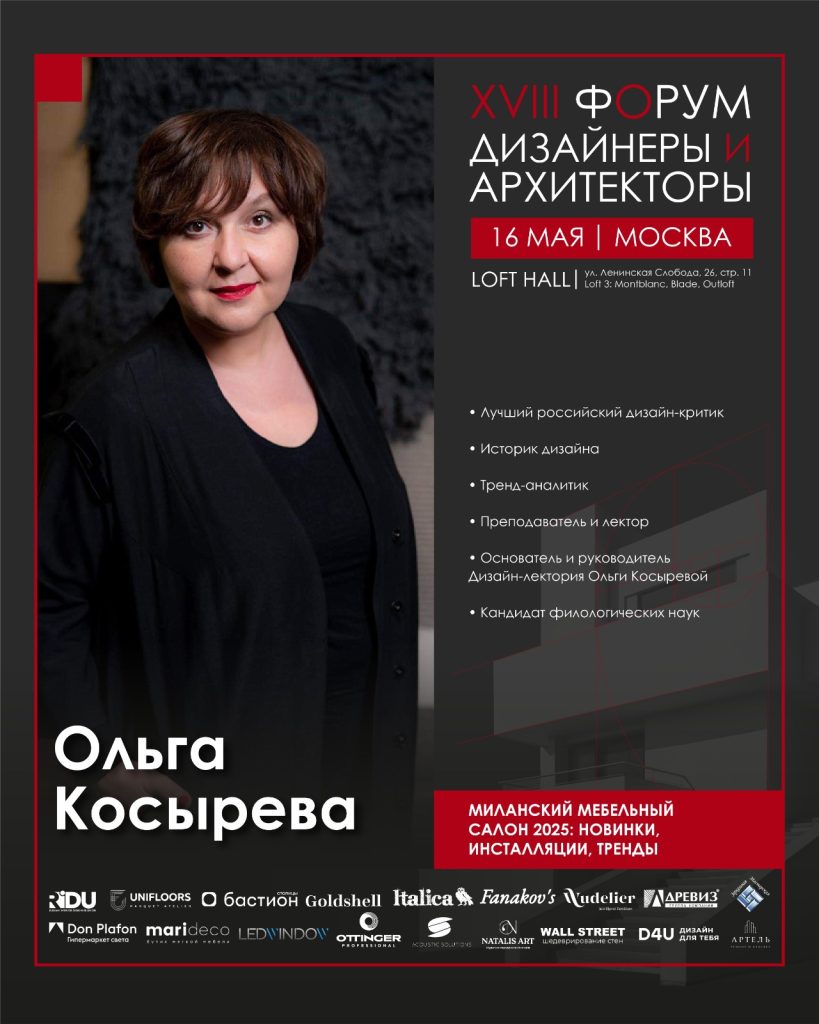 - Хедлайнер форума Ольга Косырева: представит обзор новинок, инсталляций и трендов, представленных на Миланском мебельном салоне 2025 года, что позволит участникам быть в курсе последних мировых тенденций в дизайне.