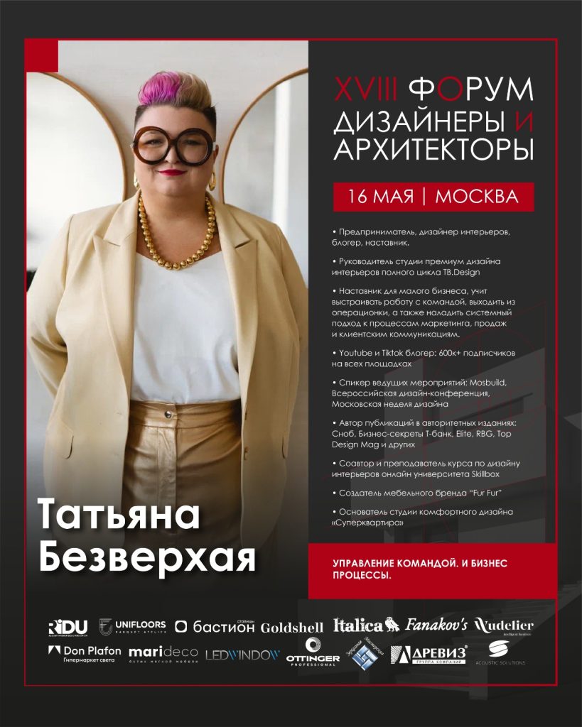 - Татьяна Безверхая поделится управленческими решениями: «Бизнес процессы. Управление командой в студии дизайна»