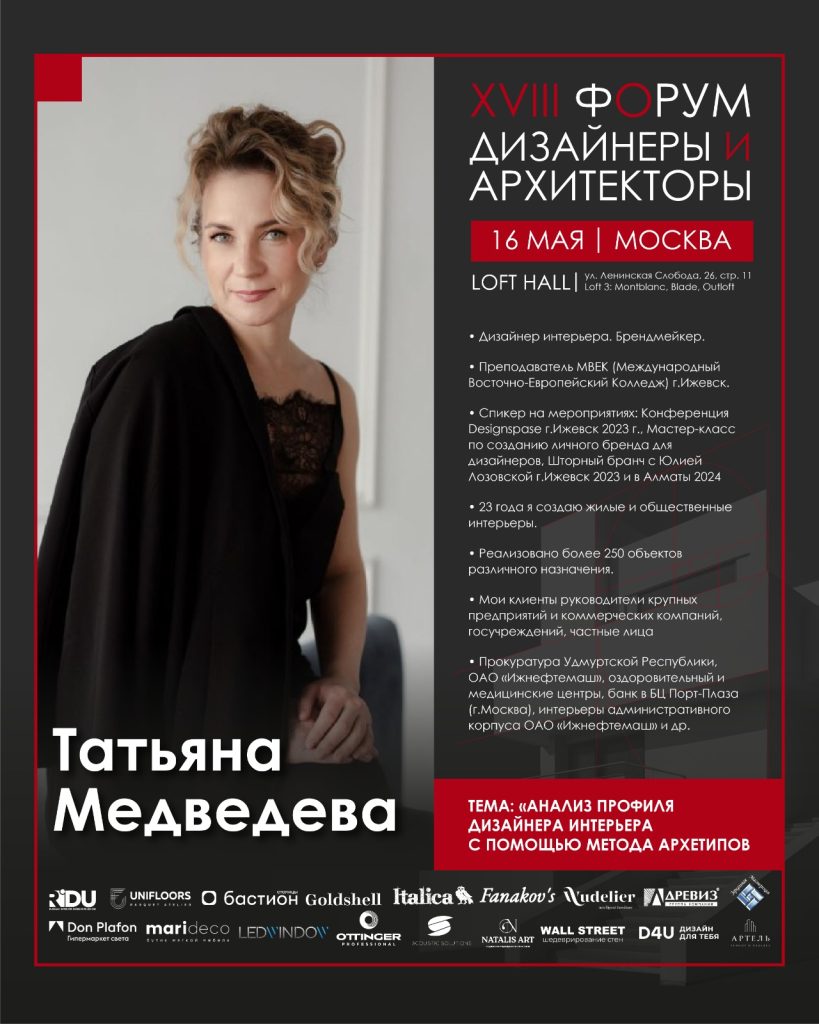 - Татьяна Медведева раскроет тему: «Анализ профиля дизайнера интерьера с помощью метода архетипов».