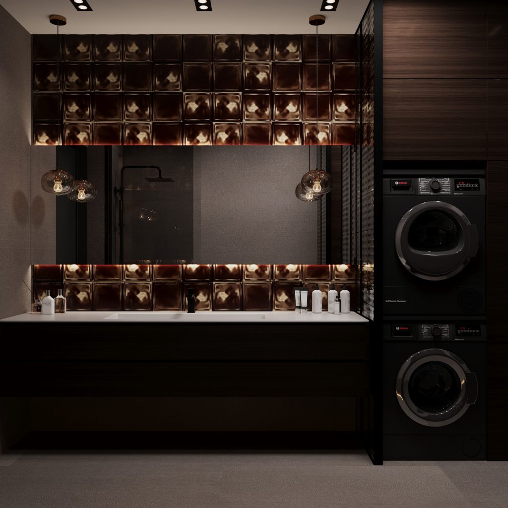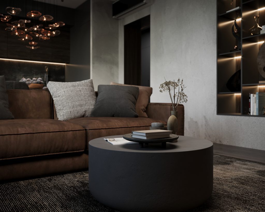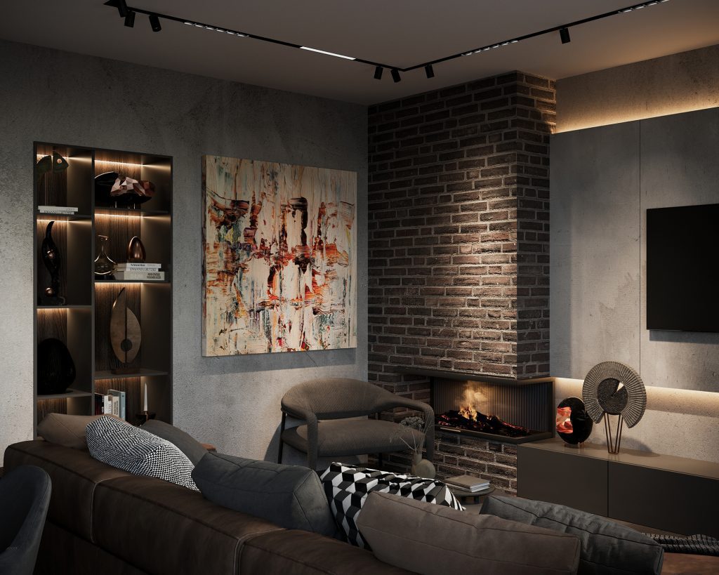 Стояла задача создать томный и обволакивающий интерьер, без активной цветовой гаммы, но с обилием сложных темных оттенков из современных отделочных материалов. Мы объединили кухню-гостиную, благодаря чему удалось получить просторное помещение, где комфортно может разместиться вся семья, в то же время создав достаточное пространство для скрытого хранения. Зона камина и различные сценарии освещения создали уютную атмосферу, добавив акцент с помощью ультра актуальной штукатурки «под бетон».